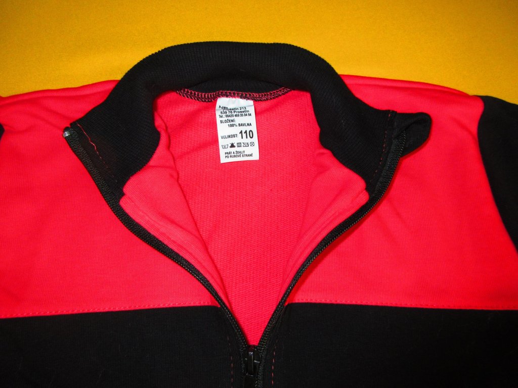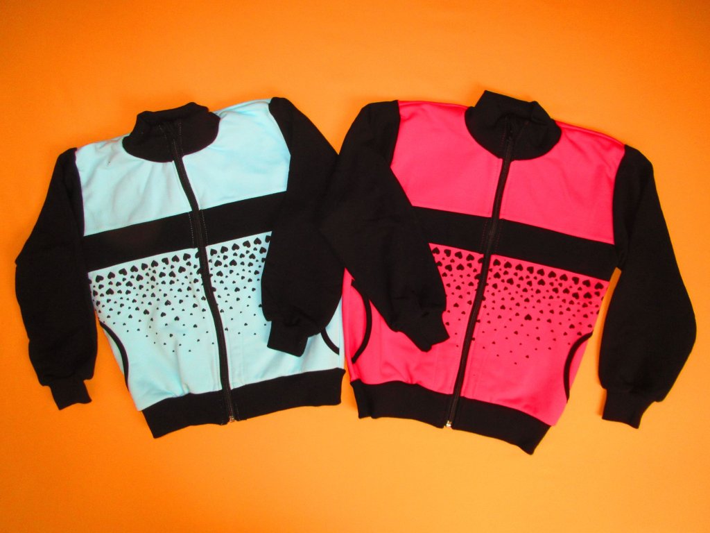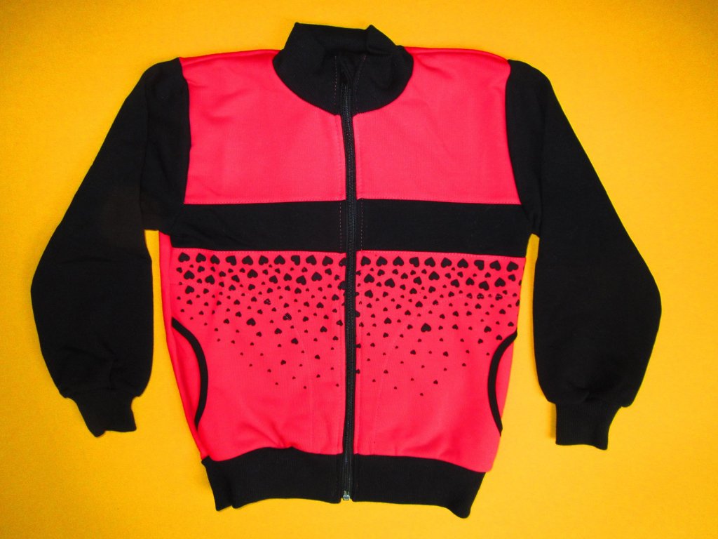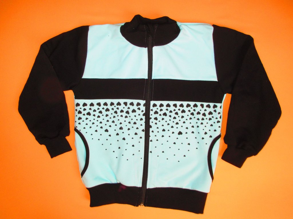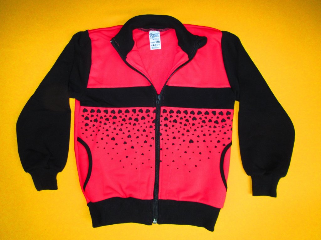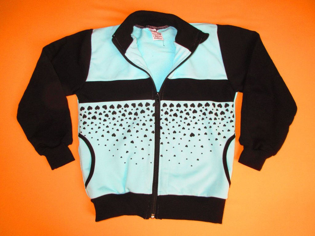 Bavlněná celopropínací mikina se stojáčkem je ušita z příjemného 100% bavlněného nepočesaného úpletu. Přední část mikiny je ozdobena všitým pruhem z černé látky, který dělí mikinu na horní část bez potisku a spodní část s potiskem a dvěma všitými kapsami zdobenými výrazným černým olemováním. Potisk s motivem srdíček je prodyšný a bez problémů vydrží opakované praní. Propínání na barevně sladěný zip má u krku všitou látkovou ochranu proti skřípnutí a odírání. Spodní část mikiny a rukávy jsou zakončeny širokým pružným lemem stejné barvy jako rukávy. Doporučený způsob praní v pračce na 40⁰C. Prát a žehlit po rubové straně.
