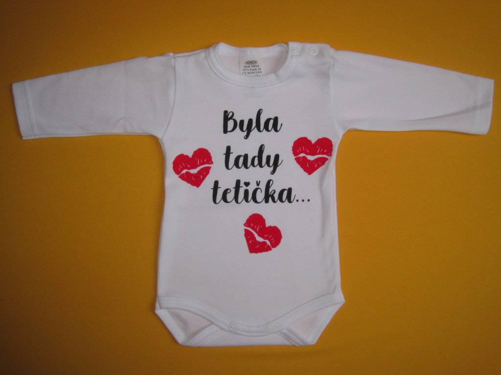 Kojenecké body je na předním díle ozdobeno veselým potiskem s pusinkami a nápisem Byla tady tetička. Zadní díl je jednobarevný bez potisku. Kvalitní potisk vydrží bez problémů opakované praní. Na levém rameni a v rozkroku je propínání na patentky, které usnadňuje oblékání a přebalování. Rukávy jsou zakončeny dvojitě prošitým zahnutým lemem. Doporučený způsob praní v pračce na 40ᵒC. Prát a žehlit po rubové straně. Body je vtipným a milým dárkem pro miminko.