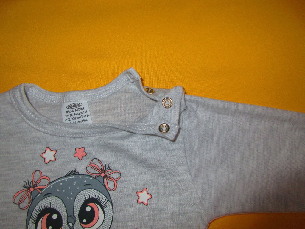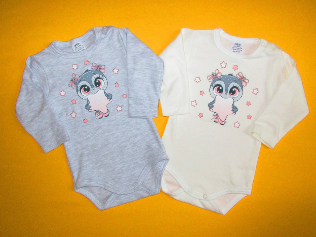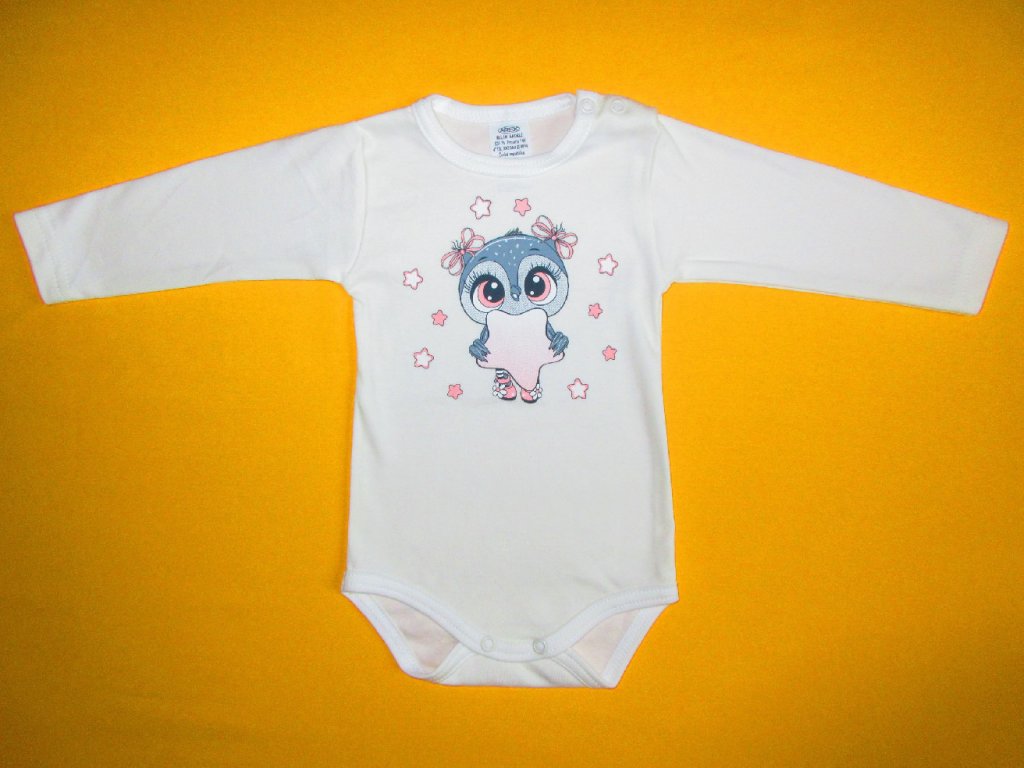 Body s dlouhým rukávem je ušito z příjemného bavlněného materiálu. Přední díl je ozdoben kvalitním potiskem s motivem roztomilé sovičky. Potisk bez problémů vydrží i opakované praní. Na levém rameni a v rozkroku má body propínání na patentky. Rukávy jsou zakončeny dvojitým prošitím. Kulatý výstřih a dolní část bodyčka jsou ukončeny stejnobarevným olemováním. Doporučený způsob praní v pračce na 40ᵒC. Prát a žehlit po rubové straně.