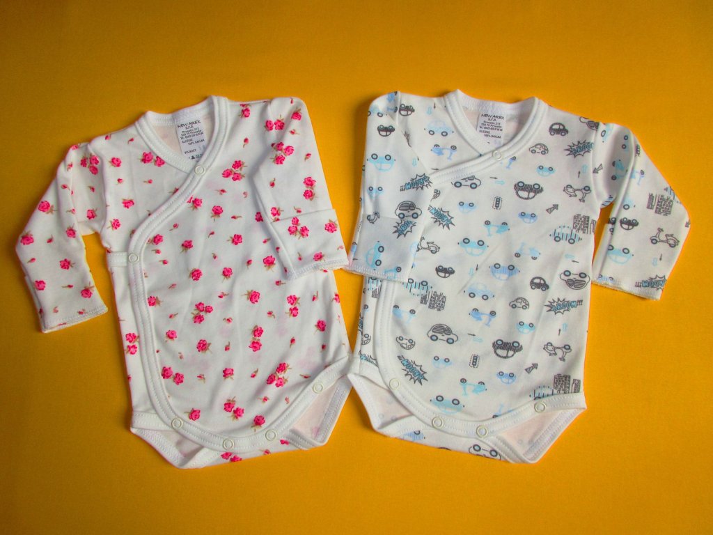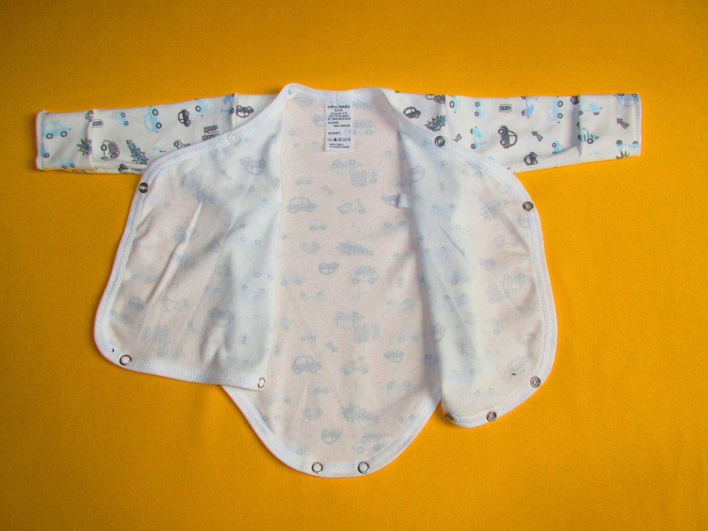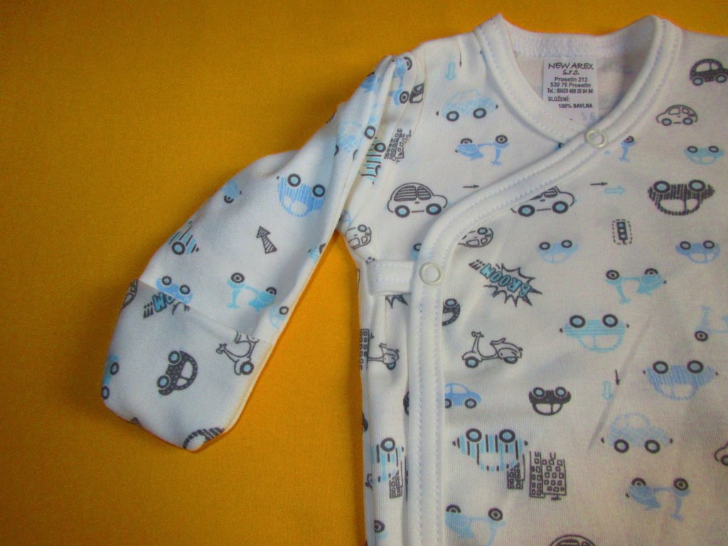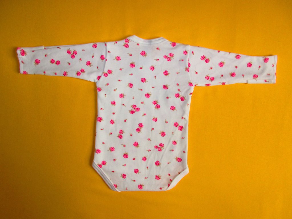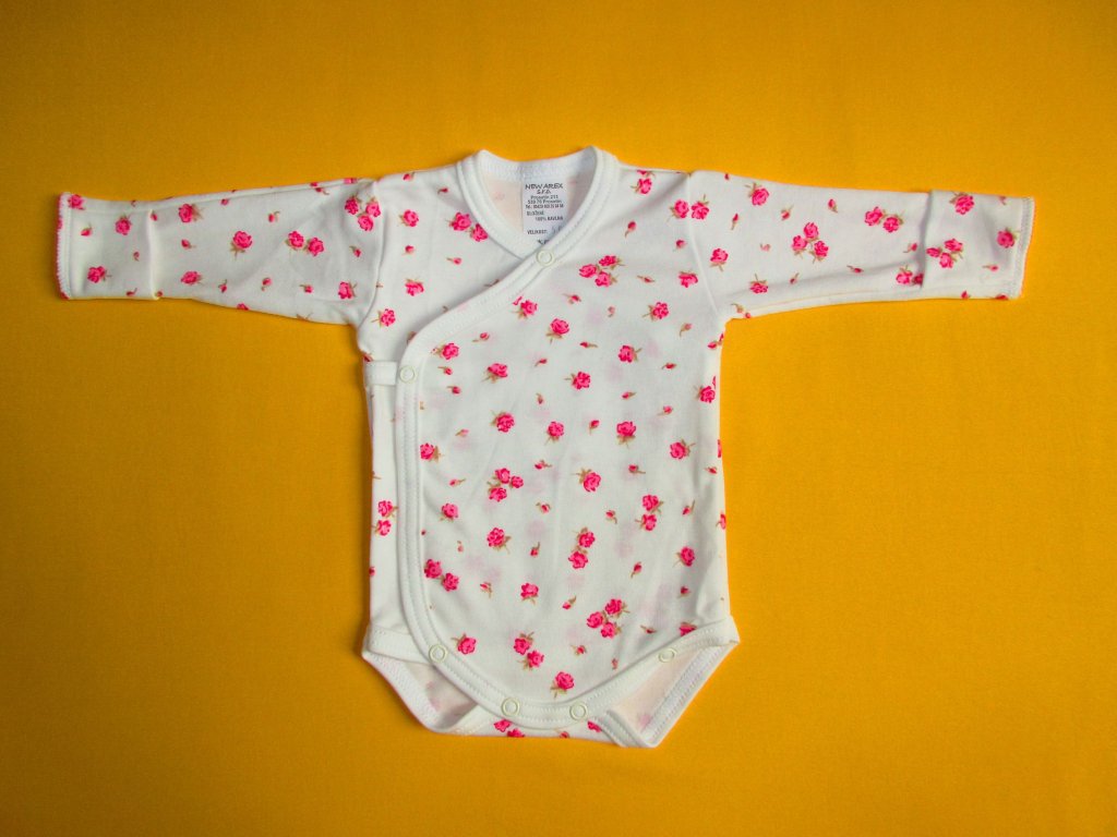 Kojenecké body, které poskytuje mamince i miminku maximální pohodlí. Díky zavinovacímu střihu je jeho oblékání velice snadné, protože není nutné přetahování přes hlavičku. Rukávy jsou ukončeny manžetkami, které se dají ohrnout přes ruce miminka, čímž vytvoří rukavičky, které zabrání poškrábání tváře miminka nehtíky a udrží ručičky v teple.. Body je ušito z jemného 100% bavlněného úpletu, ozdobeného něžným celopotiskem. Zapínání je na na barevně sladěné patentky. Doporučený způsob praní: v pračce na 40ᵒC. Prát a žehlit po rubové straně.