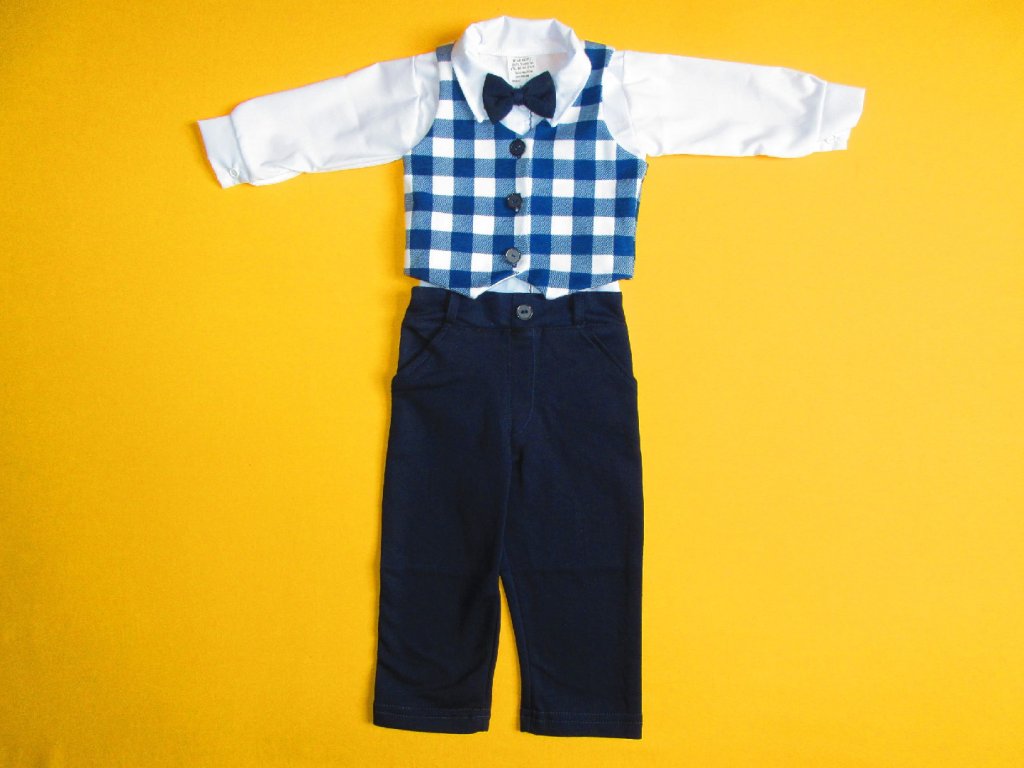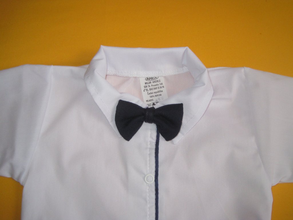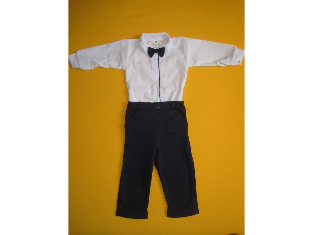 Slavnostní dětský motýlek v z bavlněného úpletu tmavěmodré barvy je připevněn na gumičce, která drží motýlka na krku. Nádherný doplněk například ke slavnostní košili - body a slavnostním kojeneckým kalhotám, vhodný pro vítání občánků, svatby a další slavnostní příležitosti.