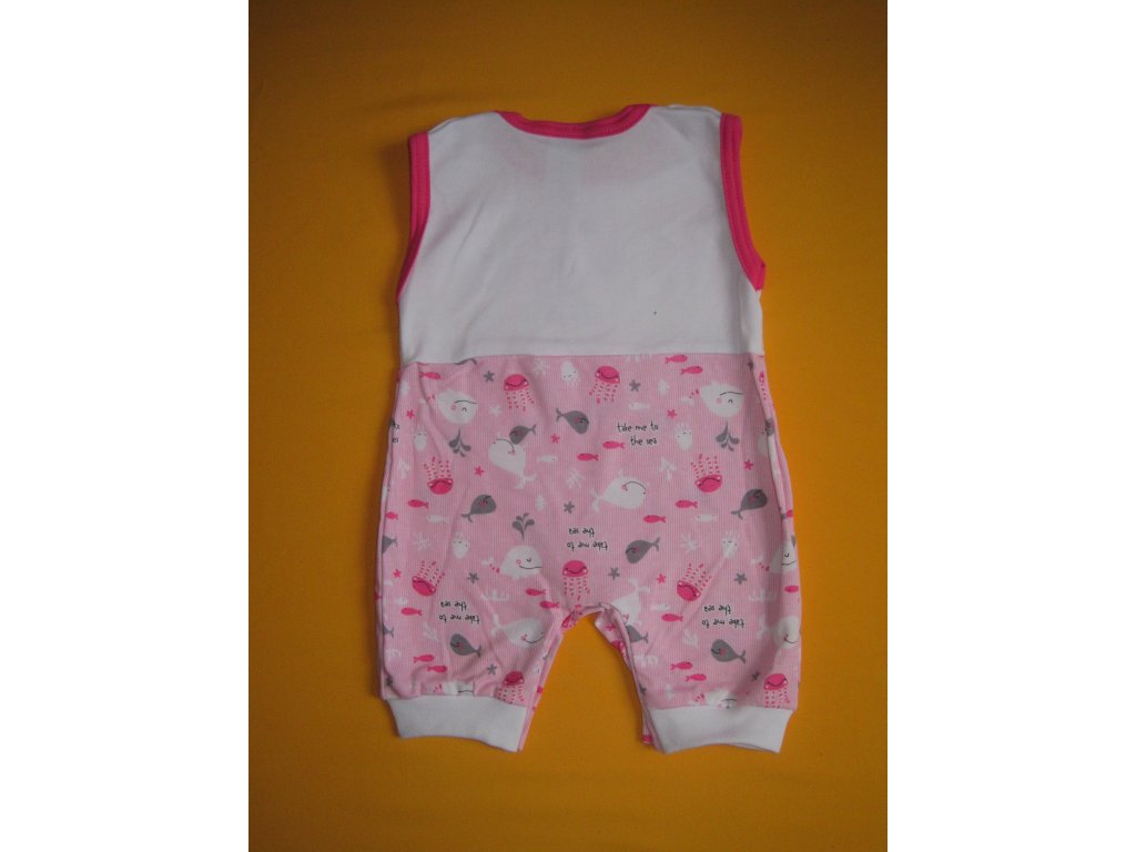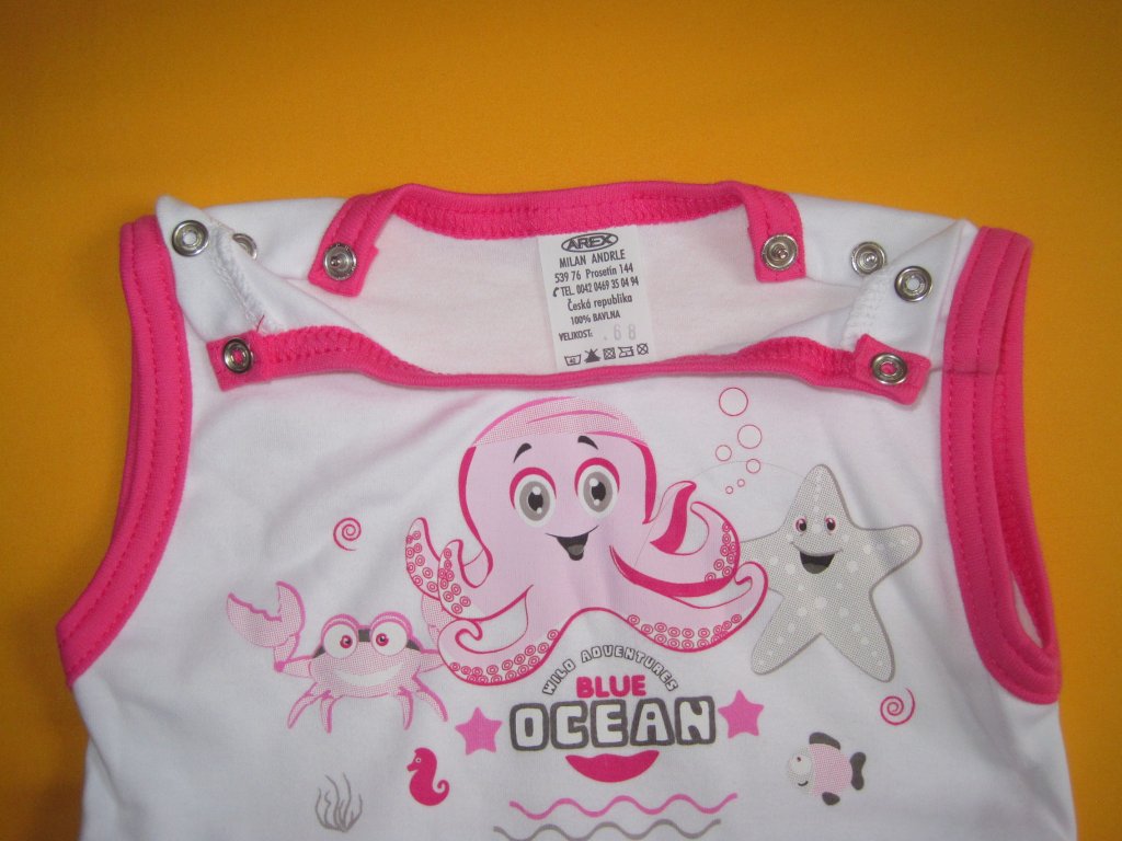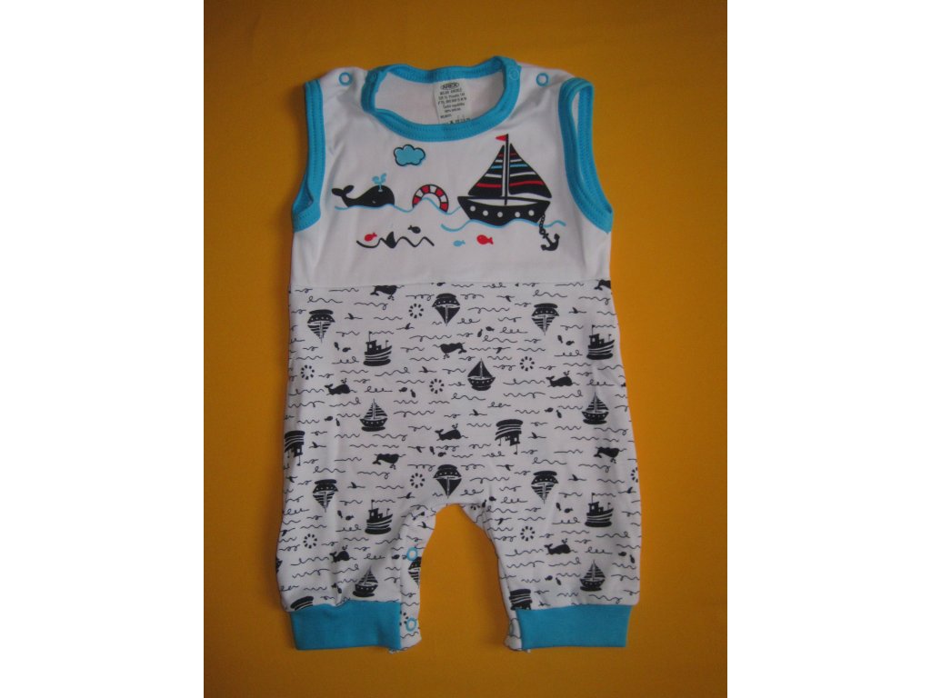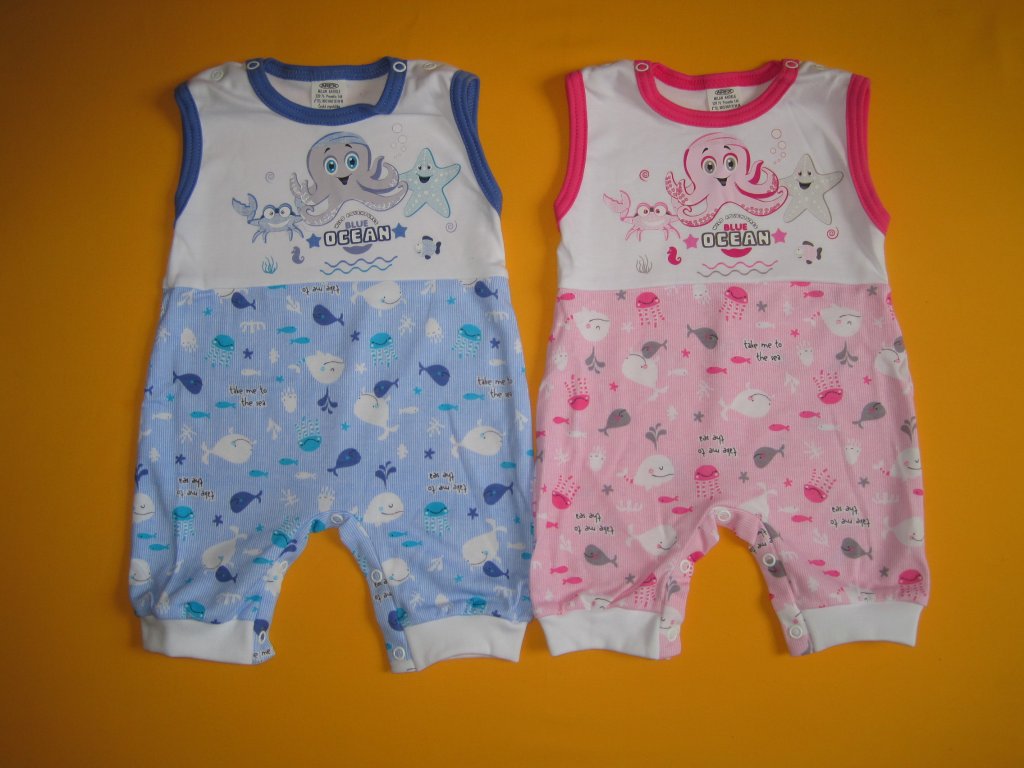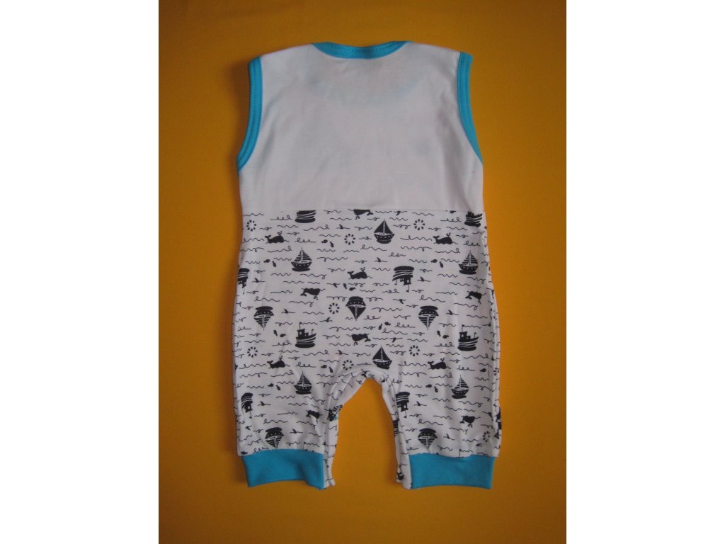 Letní dupačky z velmi příjemné lehké bavlny jsou ozdobeny kvalitním potiskem s veselými mořskými motivy. Potisk bez problémů vydrží opakované praní. Krátké nohavice jsou zakončeny pružným lemem. Pro snadné oblékání a přebalování je na obou ramínkách a v rozkroku propínání na patentky. Výstřih a průramky jsou barevně olemovány. Doporučený způsob praní v pračce na 40ᵒC. Prát a žehlit po rubu.
