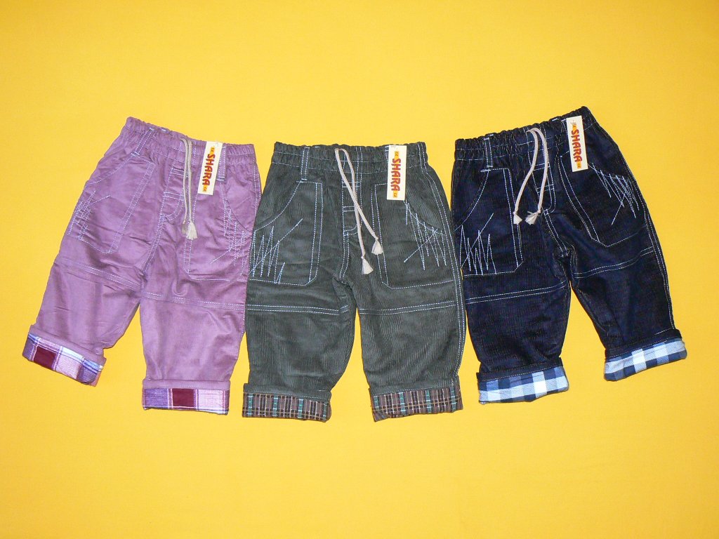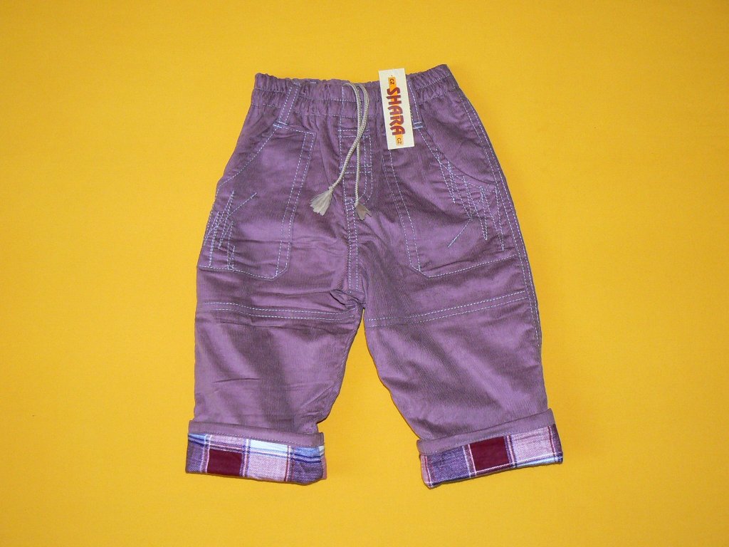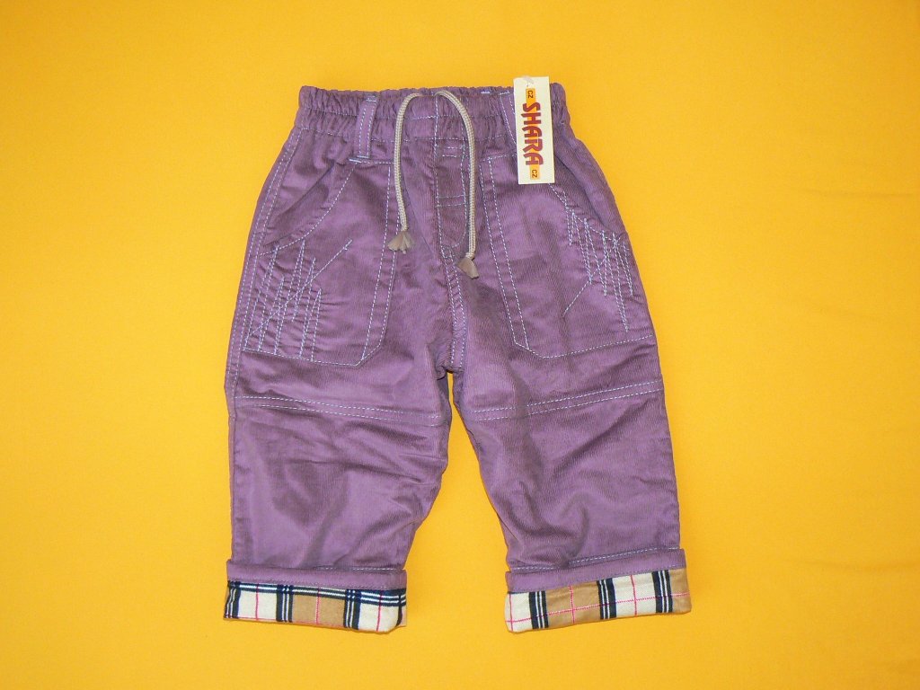 Manšestrové kalhoty podšité barevně sladěným flanelem jsou velmi vhodné pro chladné dny. Délku nohavic je možné upravit ohrnováním. Kalhoty mají v pase gumu a šňůrku. Na předním i zadním díle jsou našité kapsy. Zdobícím prvkem je výrazné prošívání.