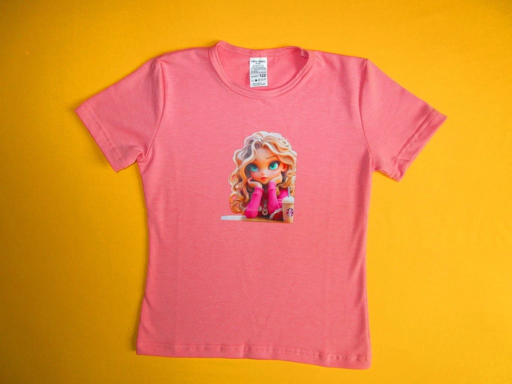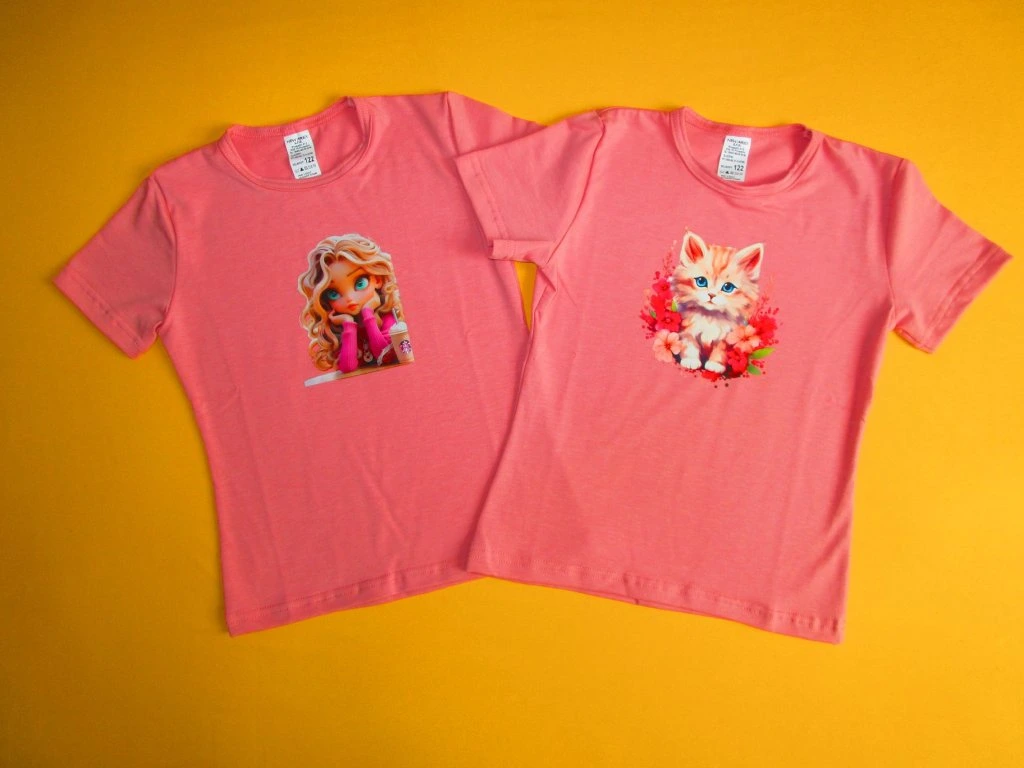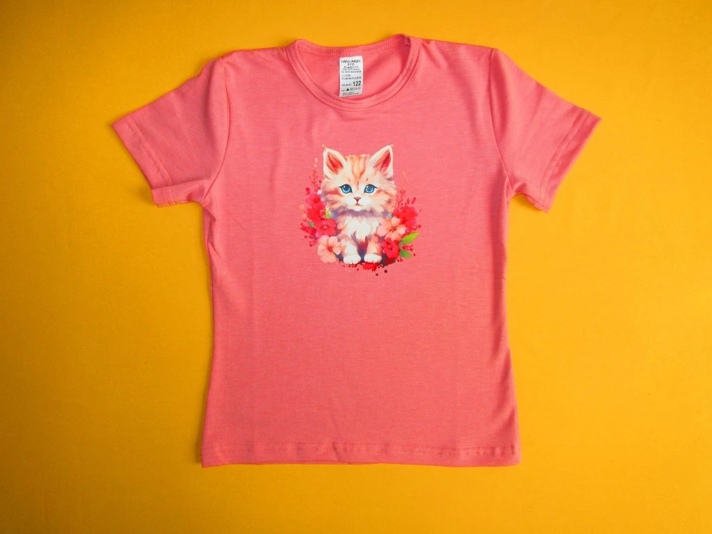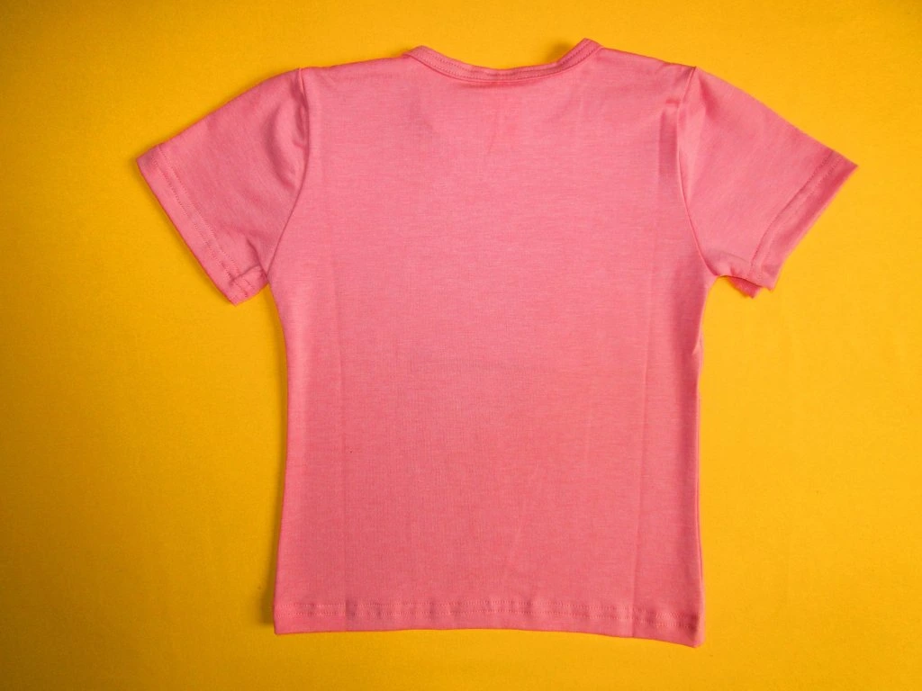 Letní dívčí tričko s krátkým rukávem je ušito z příjemného mírně elastického bavlněného materiálu. Přední díl je ozdoben kvalitním prodyšným sítotiskem s různými motivy, který bez problémů vydrží opakované praní. Tričko má mírně projmutý střih. Kulatý výstřih je zakončen lemováním s dvojitým prošitím. Spodní okraj trička a rukávy jsou zakončeny Rovně dvojitým prošitím. Doporučený způsob praní: v pračce na 40ᵒC. Prát a žehlit po rubové straně.