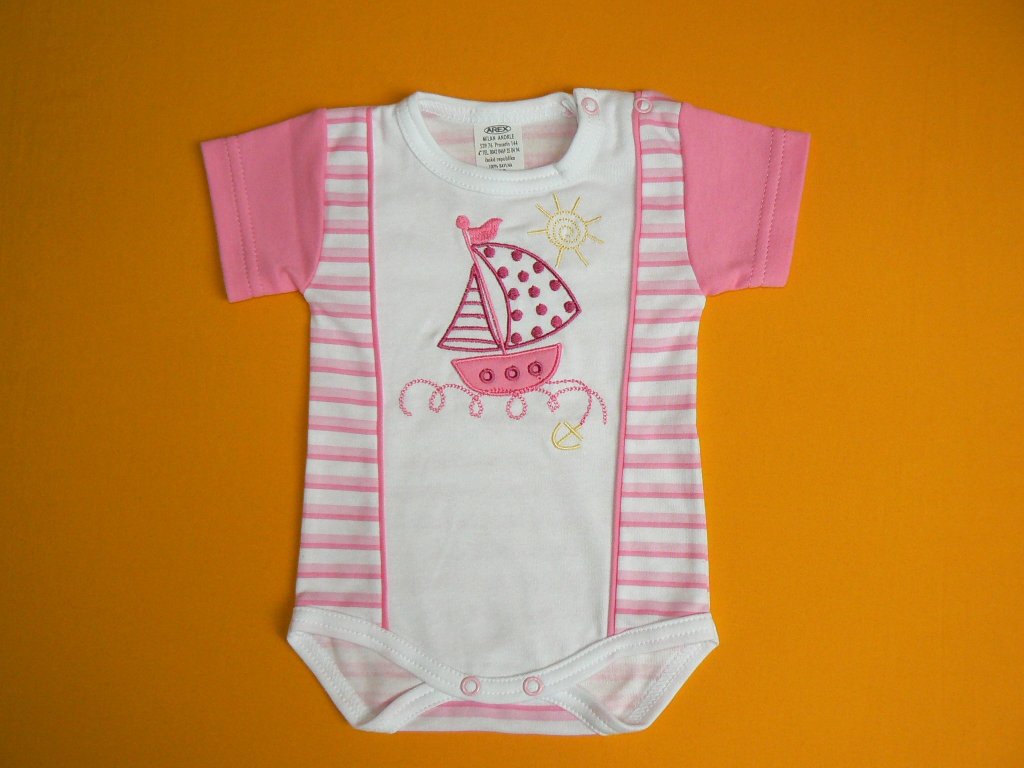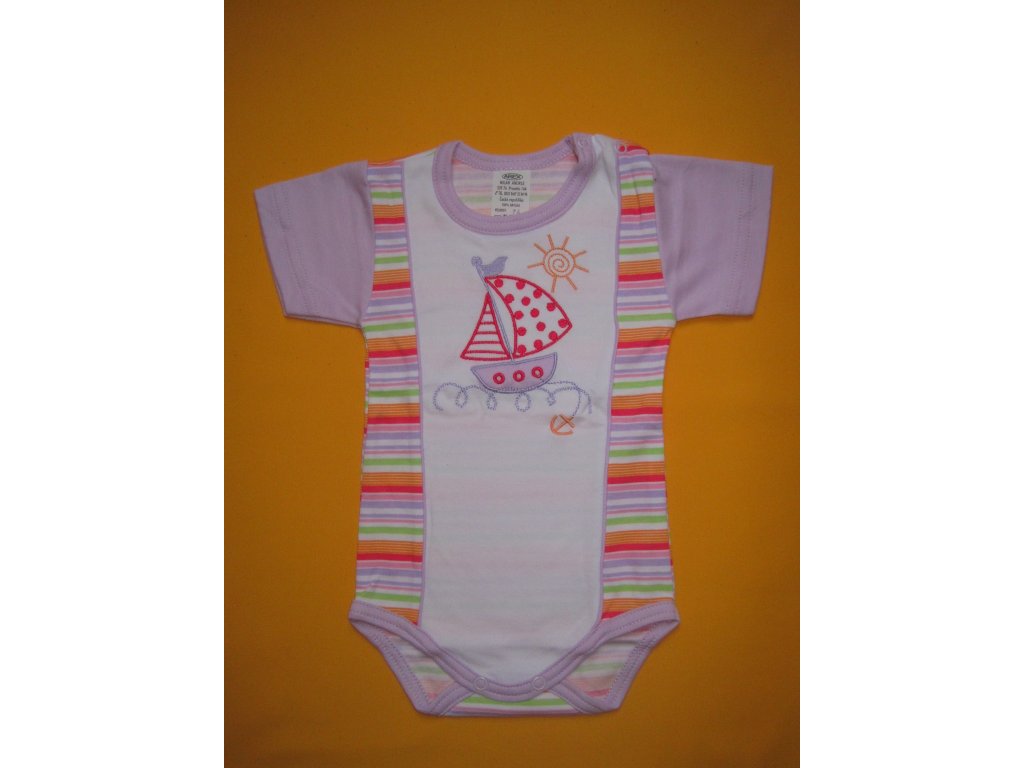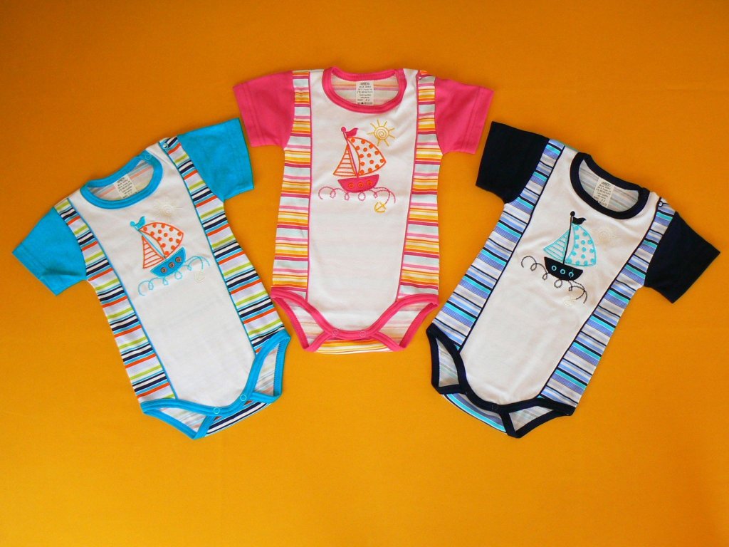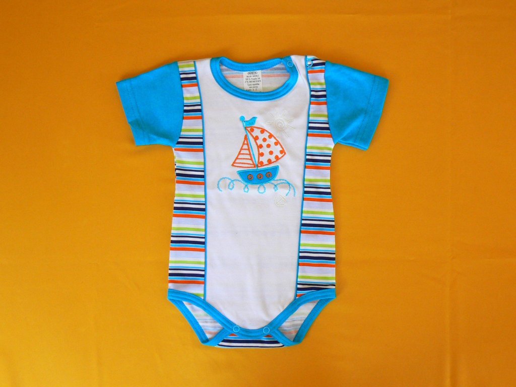Kojenecké body s krátkým rukávem je zdobeno barevně sladěnými proužky a výšivkou lodičky na předním díle. Na levém rameni je umístěno propínání pro snadné oblékání. Propínání na rameni a ve spodní části je na cvoky. Lze prát v pračce na 40°C.