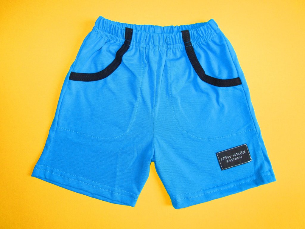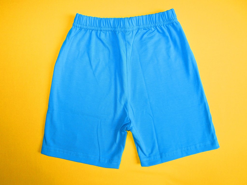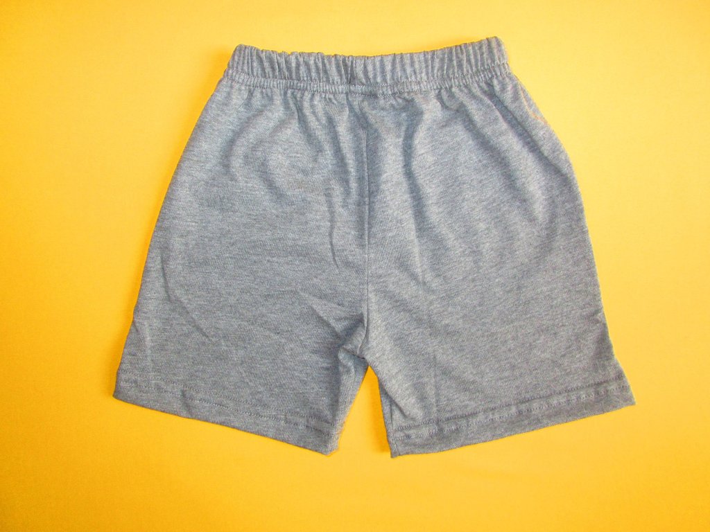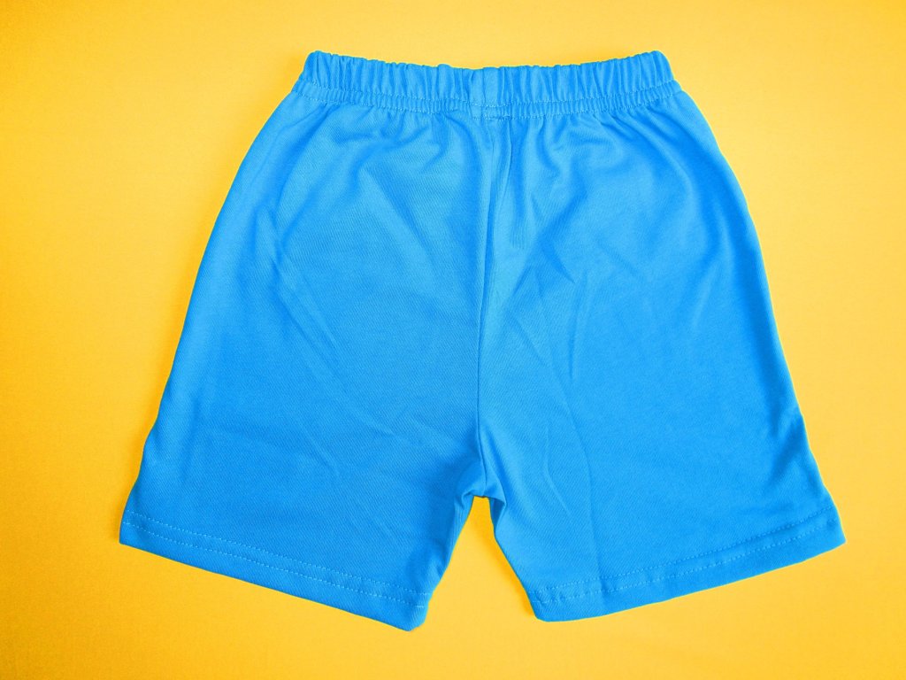 Sportovní kraťasy z příjemného nepočesaného lehkého bavlněného úpletu mají v horní části předního dílu všity 2 praktické kapsy zvýrazněné lemováním s dvojitým prošitím. Ve spodní části levé nohavice jsou kraťasy ozdobeny jednoduchou nášivkou s nápisem. V pase jsou kraťasy do širší všité gumy. Nohavice jsou zakončeny volně dvojitým prošitím. Doporučený způsob praní v pračce na 40ᵒC. Prát a žehlit po rubové straně.