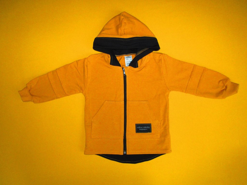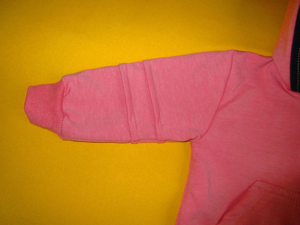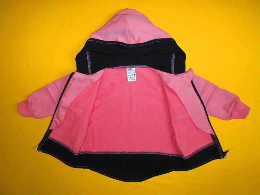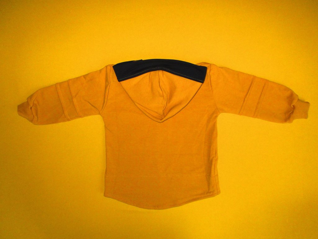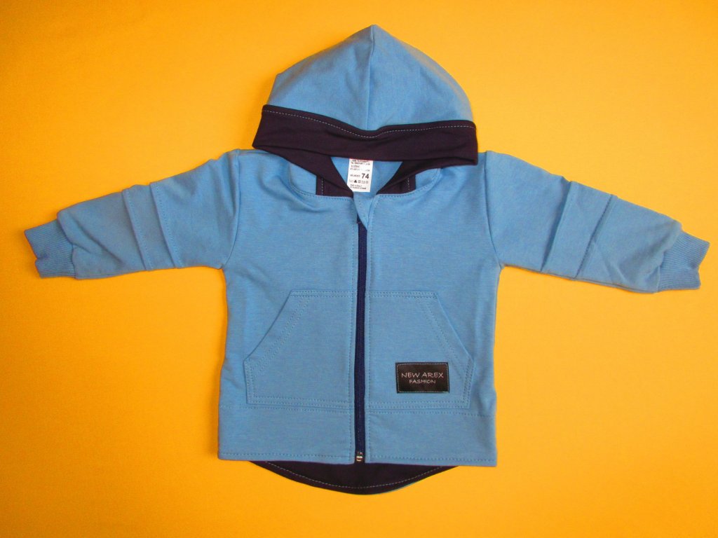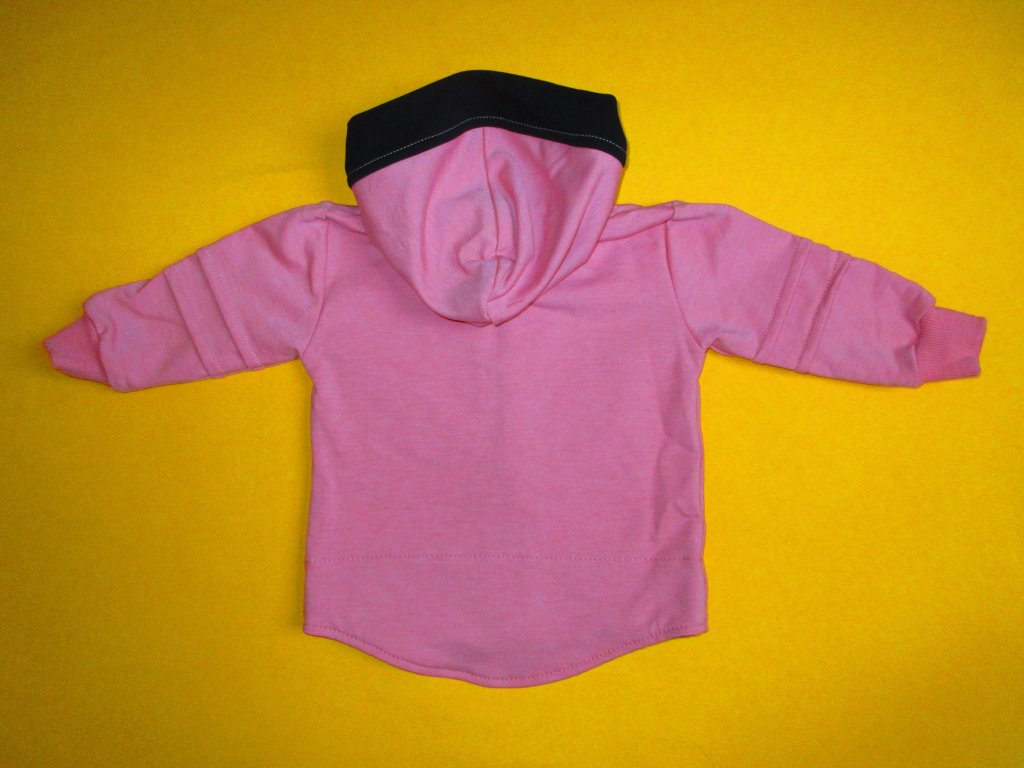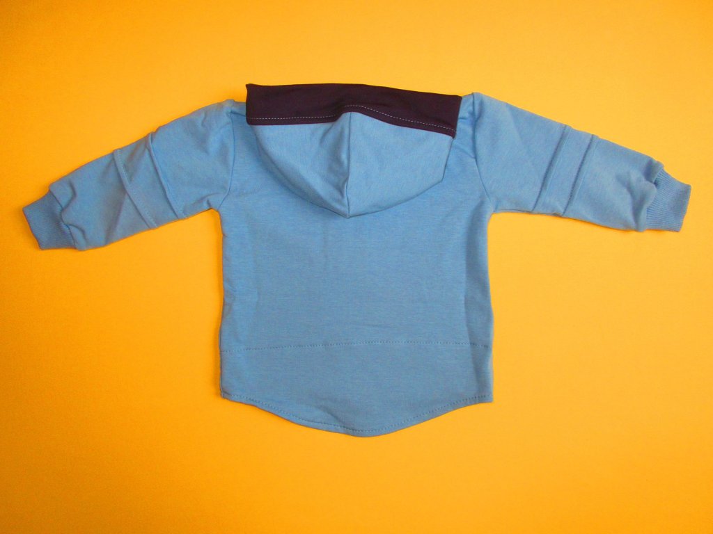 Mikina je ušita z příjemného mírně elastického nepočesaného bavlněného úpletu. Mikinu zdobí kapuce s výrazným podšitím a lemováním, s podšitím sladěný zip a prošité záhyby na rukávech. Aby nedošlo ke skřípnutí kůže na krku, je zip zakončen praktickou látkovou krytkou. Na předních dílech mikiny je našitá kapsa typu rozpůlené klokanky, která je na levé straně ozdobena nášivkou. Spodní část mikiny je z rubu podšitá stejnou látkou jako kapuce. Zadní díl je mírně prodloužený, aby chránil i spodní část zad proti chladu. Rukávy jsou zakončeny pružným lemem. Doporučený způsob praní: v pračce na 40°C. Prát a žehlit po rubové straně.