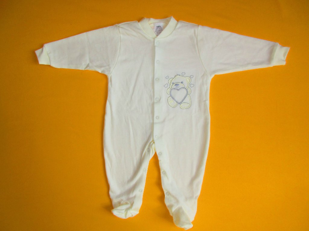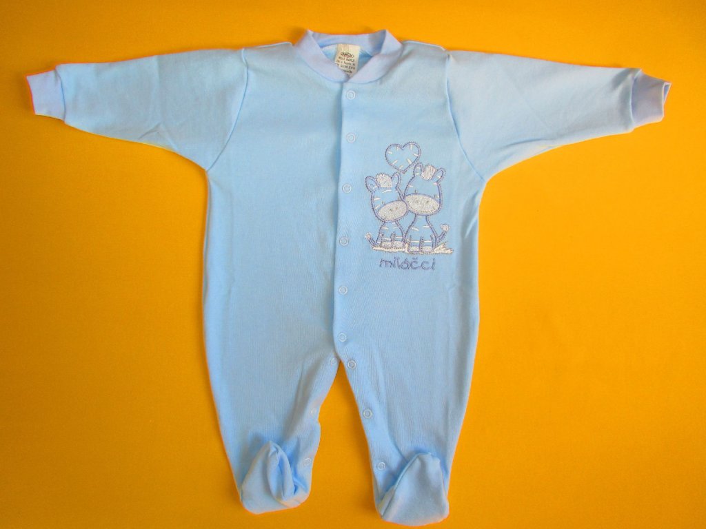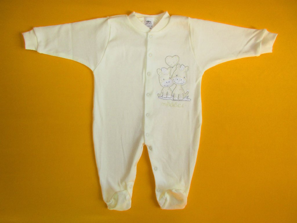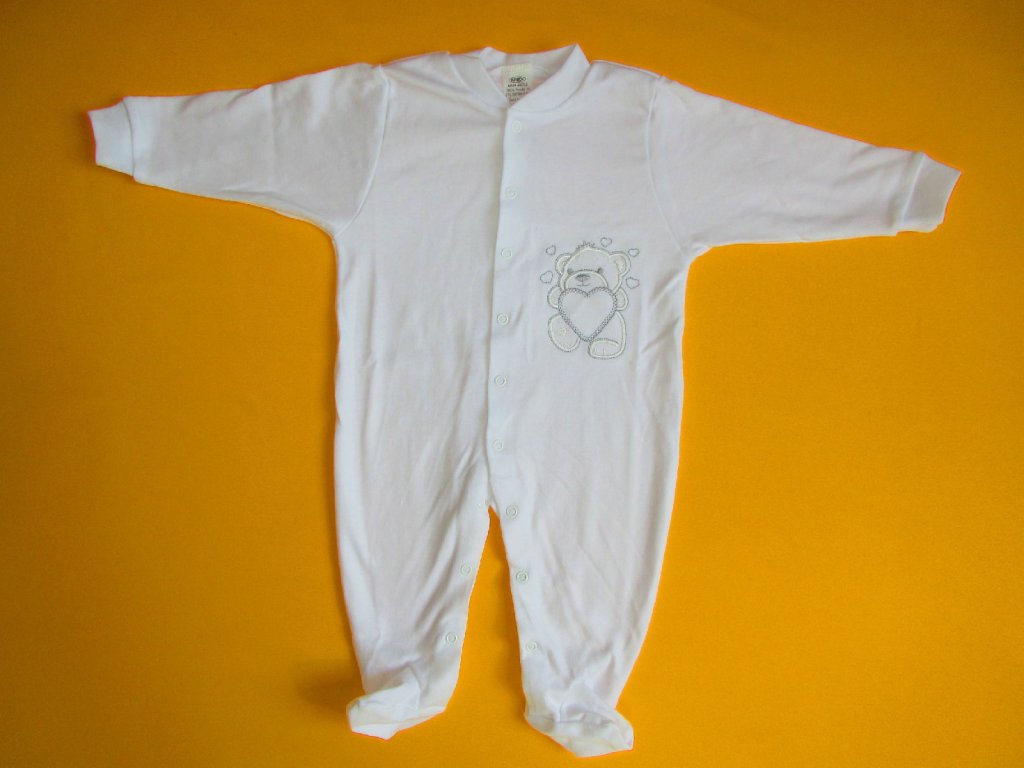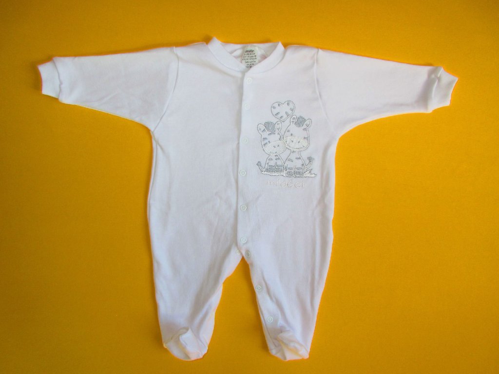 Kojenecký pyžamový overal je ušitý z jemné 100% bavlny. Pravý přední díl je ozdoben něžnou výšivkou, která je z rubu podšitá bavlněnou mřížkou, aby nedráždila citlivou pokožku miminka. Pro snadné oblékání a přebalování je overal celopropínací od patiček až po výstřih. Propínání je na barevně sladěné patentky. Výstřih a rukávy jsou ukončeny měkkým pružným lemem. Doporučený způsob praní: v pračce na 40ᵒC.