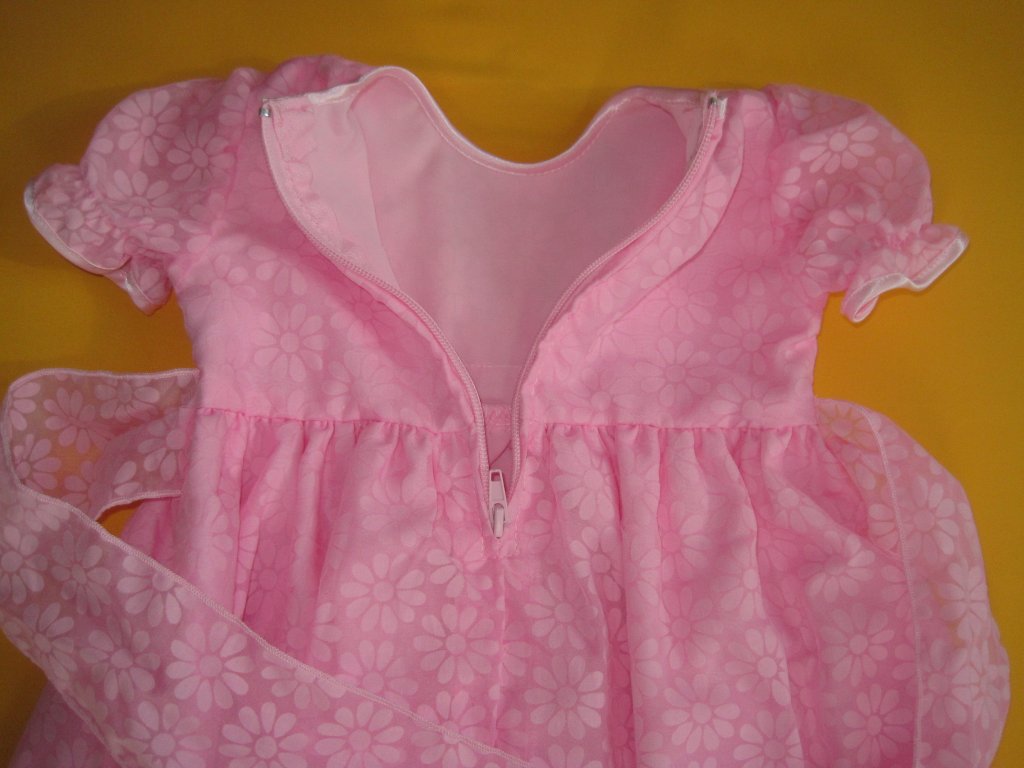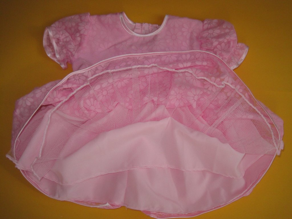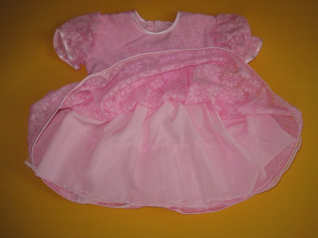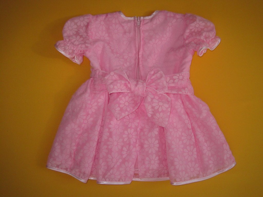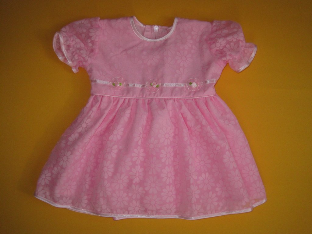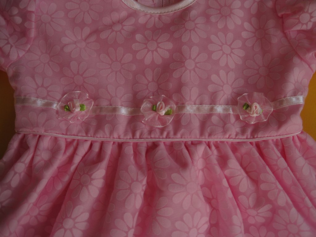 Nádherné slavnostní šatičky ze 100% bavlny jsou ozdobeny třemi kvítky na předním díle. Šatičky jsou ušity z bavlněné průsvitné látky s motivem kytiček. Podšívka celých šatů kromě rukávů je z jednobarevného bavlněného plátna, pod nabíranou sukýnkou je na podšívce našit volán z růžového tylu pro zvětšení objemu. Rukávy jsou nabírané, zakončené nařaseným volánkem olemovaným lesklým lemem, stejně jako spodní díl sukně a výstřih. Zadní díl zdobí široká mašle v pase ze stejné látky jako šaty. Pro snadné oblékání mají šaty na zádech barevně sladěný zip. Doporučený způsob praní v pračce na 40ᵒ
