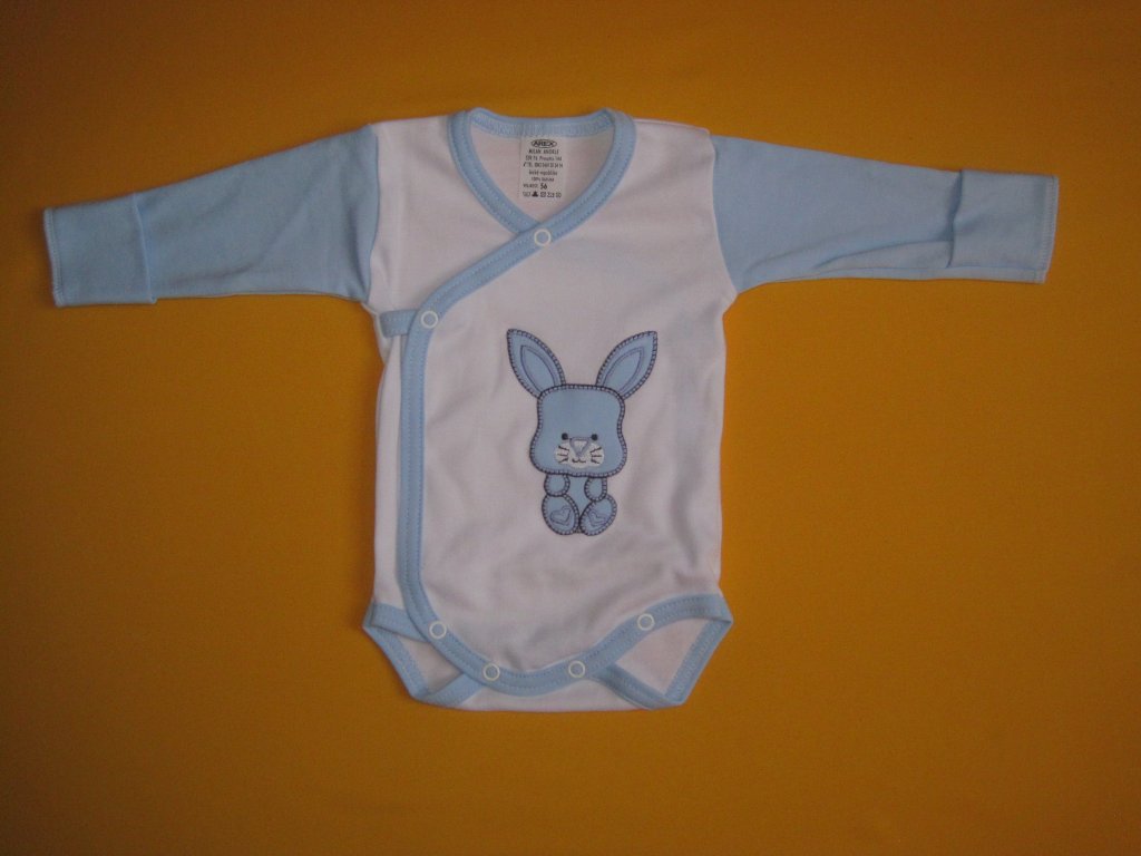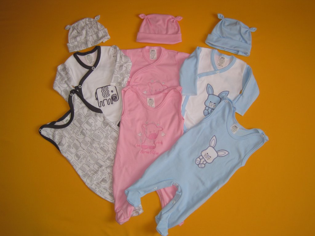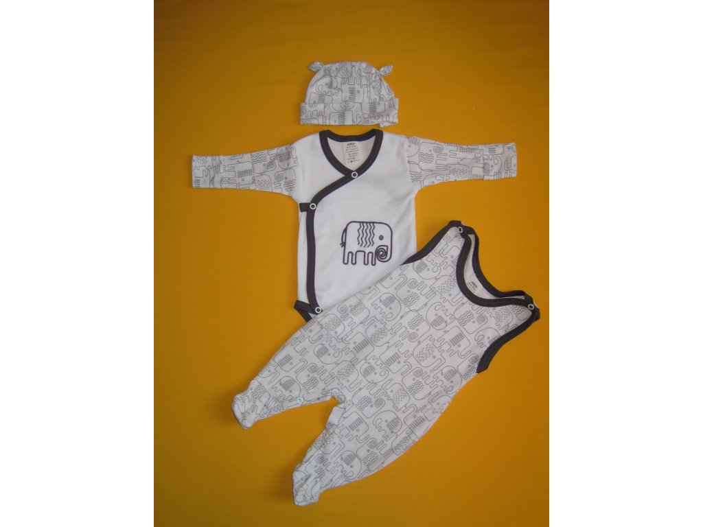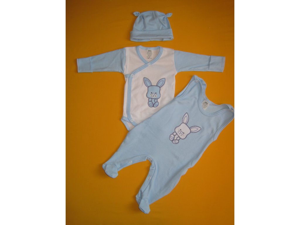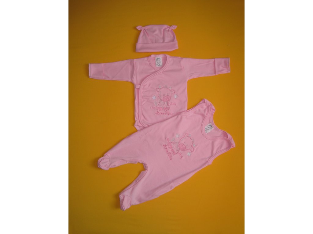 Trojdílná soupravička do porodnice je ušita z jemné 100% bavlny a skládá se z bodyčka, dupaček a čepičky. Body je zavinovací, proto se snadno obléká. Propínání je na patentky. Rukávy jsou zakončeny ohrnovacím lemem, z který lze jednoduše miminku přetáhnout pře ručičku jako rukavici. Přední díl bodyčka je ozdoben výšivkou. Dupačky jsou propínací na ramínkách a v rozkroku. Na přední straně jsou dupačky ozdobeny stejnou výšivkou či potiskem jako body. Čepička s roztomilými oušky, vytvořenými stažením rohů, má překrytí oušek a šňůrku na zavázání. Doporučený způsob praní v pračce na 40ᵒC.