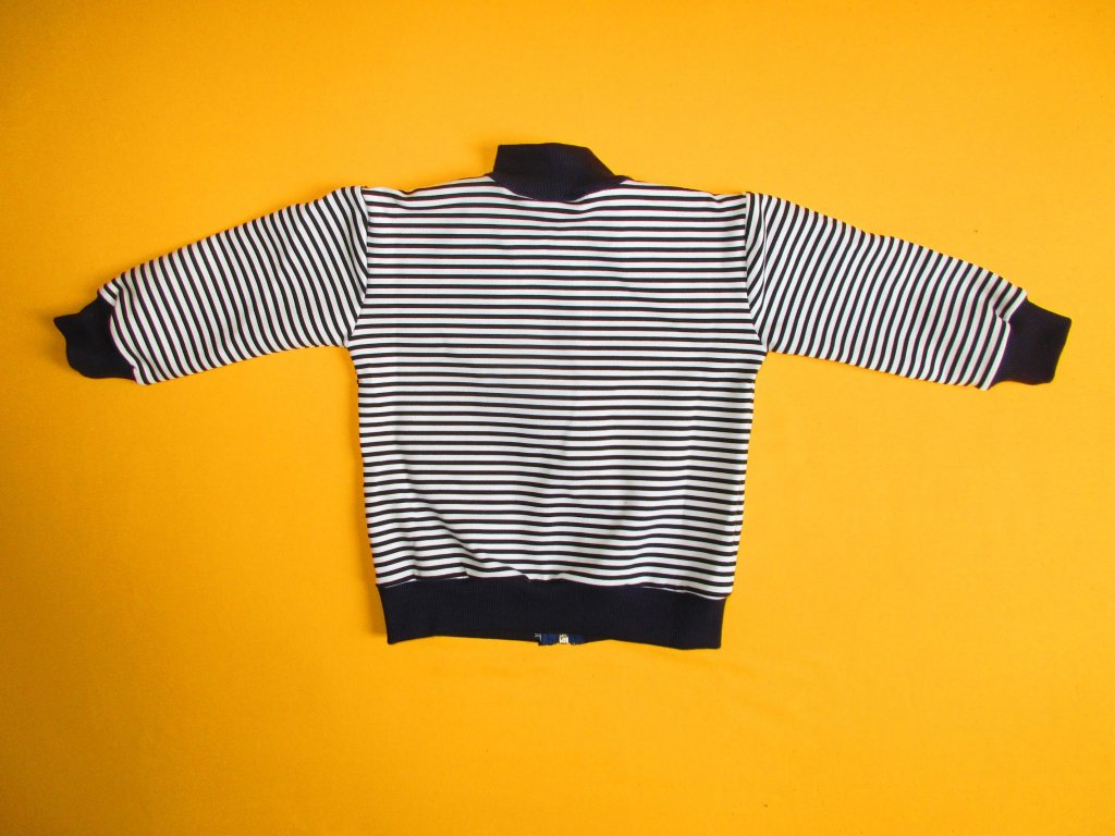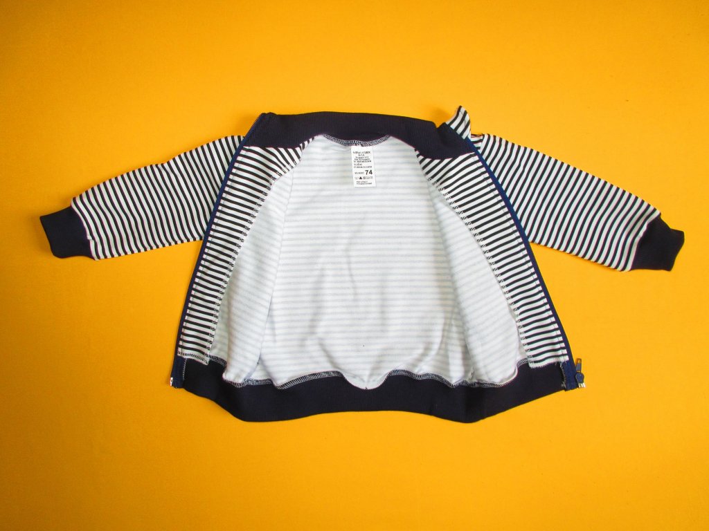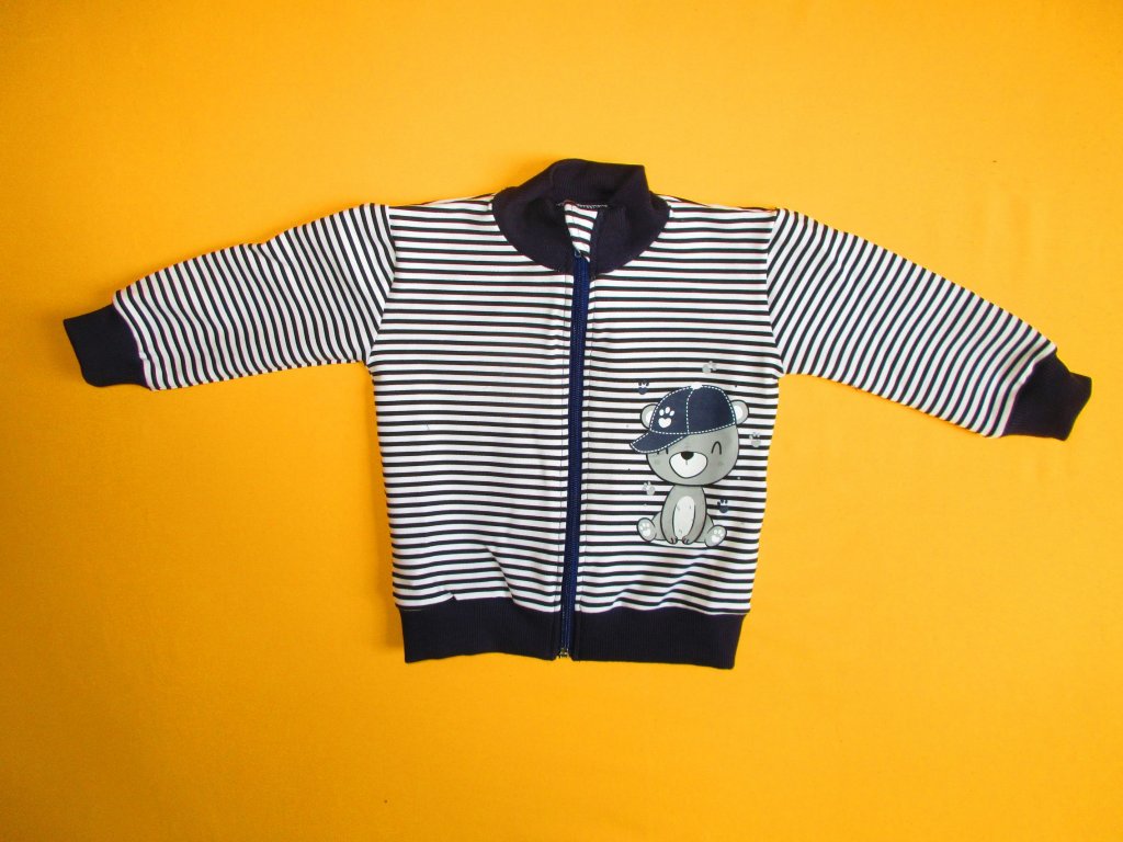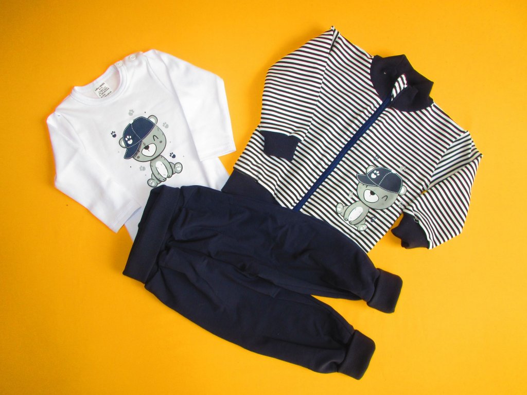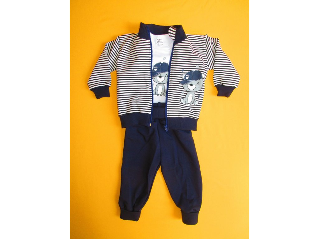Kojenecká tepláková souprava je ušita z příjemného mírně elastického bavlněného úpletu. Pruhovaná mikinka je celopropínací bez kapuce. Propínání je na barevně sladěný zip a u krku má látkovou krytku proti skřípnutí kůže. Na levém předním díle je mikina ozdobena prodyšným potiskem s motivem medvídka. Kvalitní potisk bez problémů vydrží opakované praní. Výstřih u krku, rukávy a spodní část mikiny jsou zakončeny manžetou z pružného lemu. Mikinu doplňují jednobarevné rostoucí tepláčky s širokým pružným lemem v pase a v dolní části nohavic, který se dá ohrnout a tím upravit správnou délku podle velikosti dítěte. Doporučený způsob praní v pračce na 40˚C. Prát a žehlit po rubové straně.