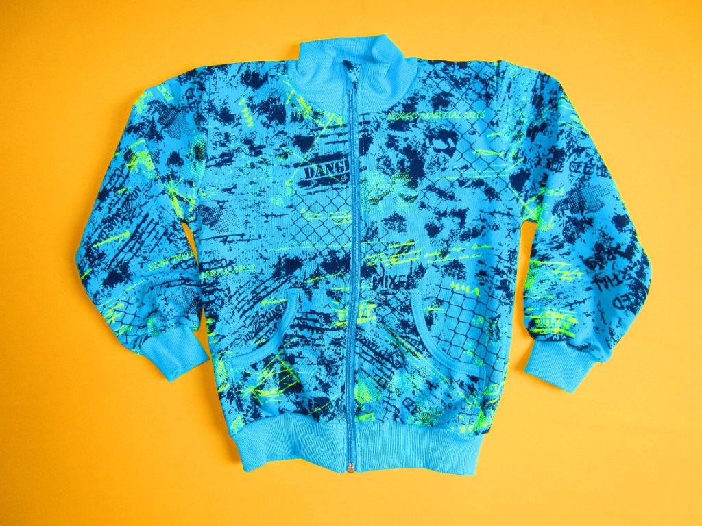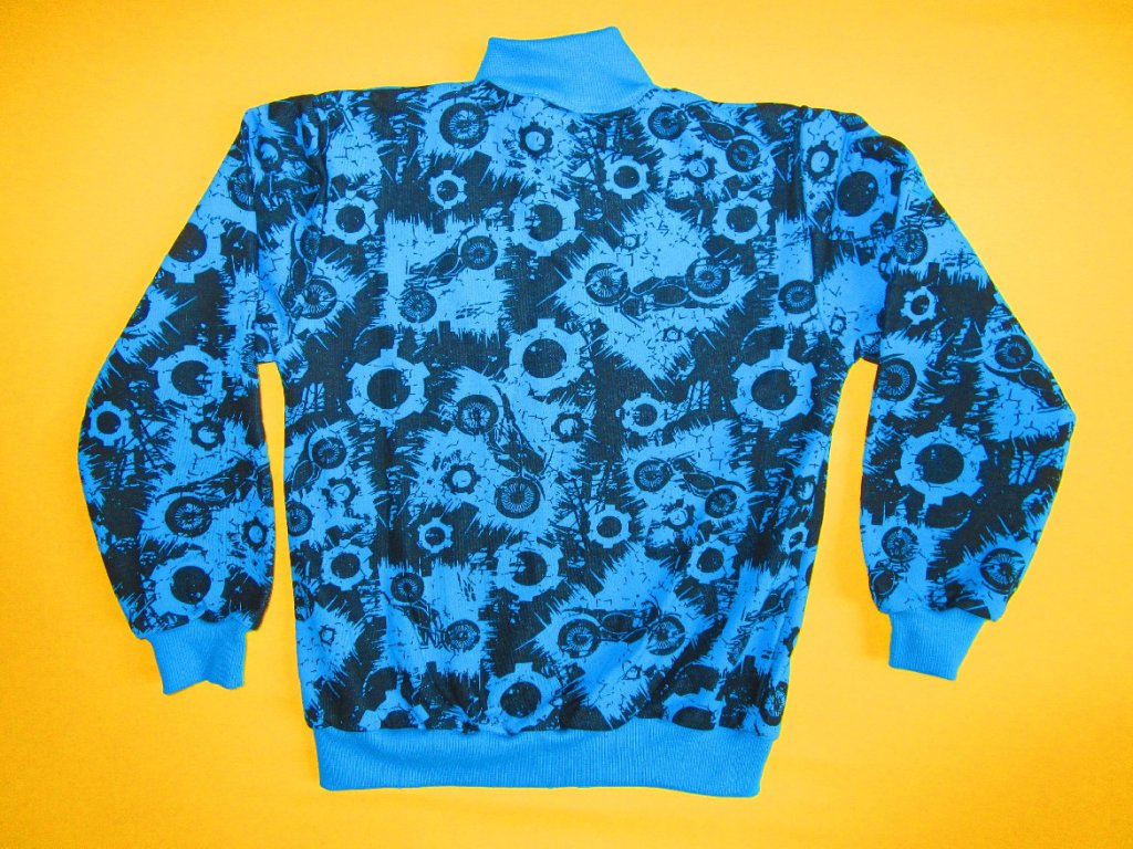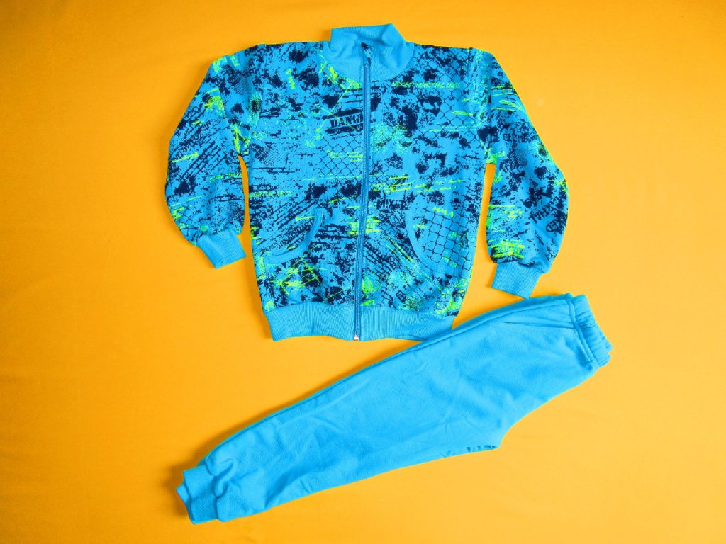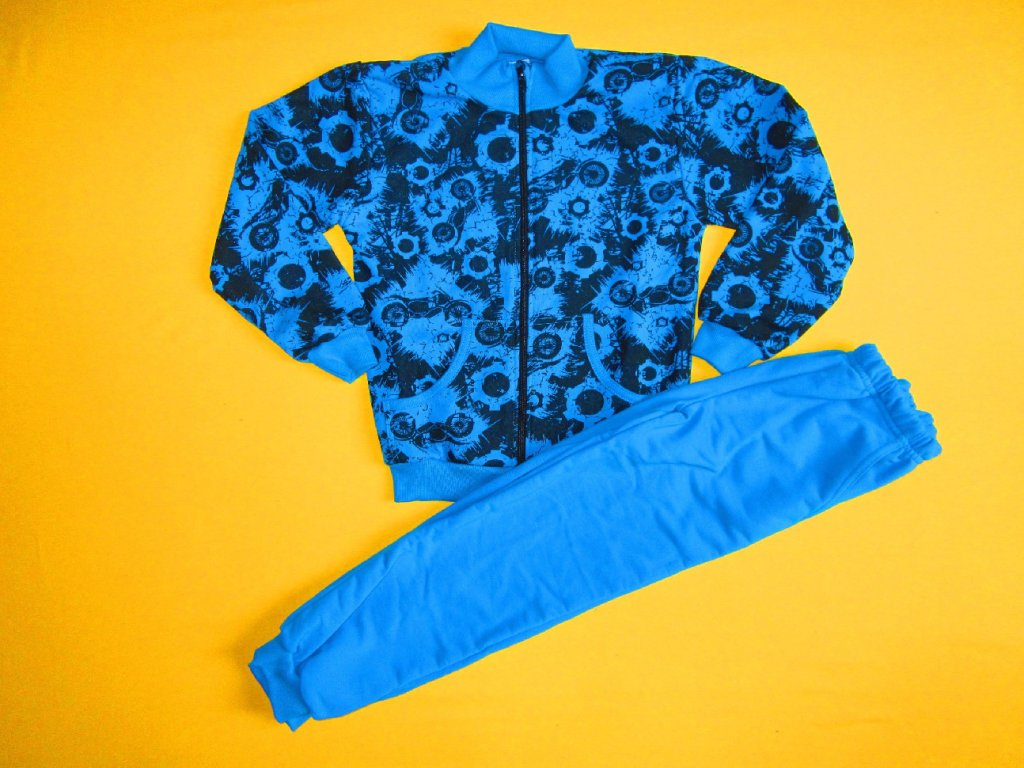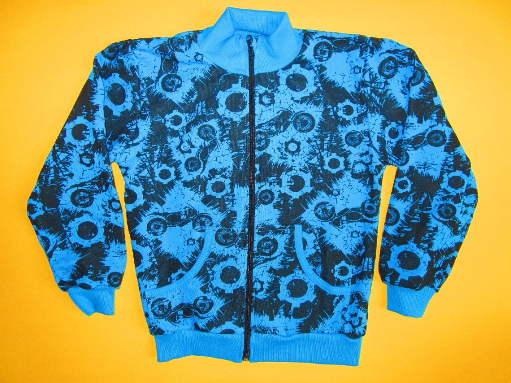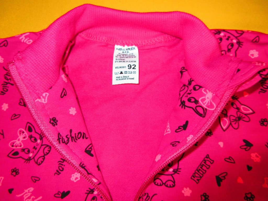 Tepláková souprava ze 100% nepočesané bavlny se skládá z mikiny se stojáčkem a tepláků s nohavicemi do manžety. Mikina je celopropínací na zip s celoplošným kvalitním potiskem, který bez problémů vydrží i opakované praní. 2 kapsy typu rozpůlené klokanky jsou našity ve spodní části předních dílů a jsou zvýrazněny barevně sladěným lemováním s tepláky. Rukávy a výstřih jsou zakončeny pružnými lemy barevně sladěnými s tepláky. U krku je všita krytka proti skřípnutí kůže. Jednobarevné jednoduché tepláky mají v horní části na pravé a levé straně předního dílu všité kapsy, nohavice jsou zakončeny manžetou z pružného lemu. V pase jsou tepláky do gumy. Díky polyesterové mřížce, která se vplétá do bavlny, nedochází k vytahování kolen a kapes. Doporučený způsob praní v pračce na 40ᵒC. Prát a žehlit po rubové straně.