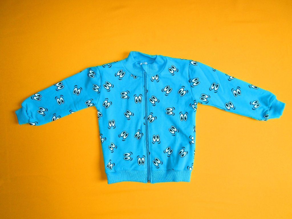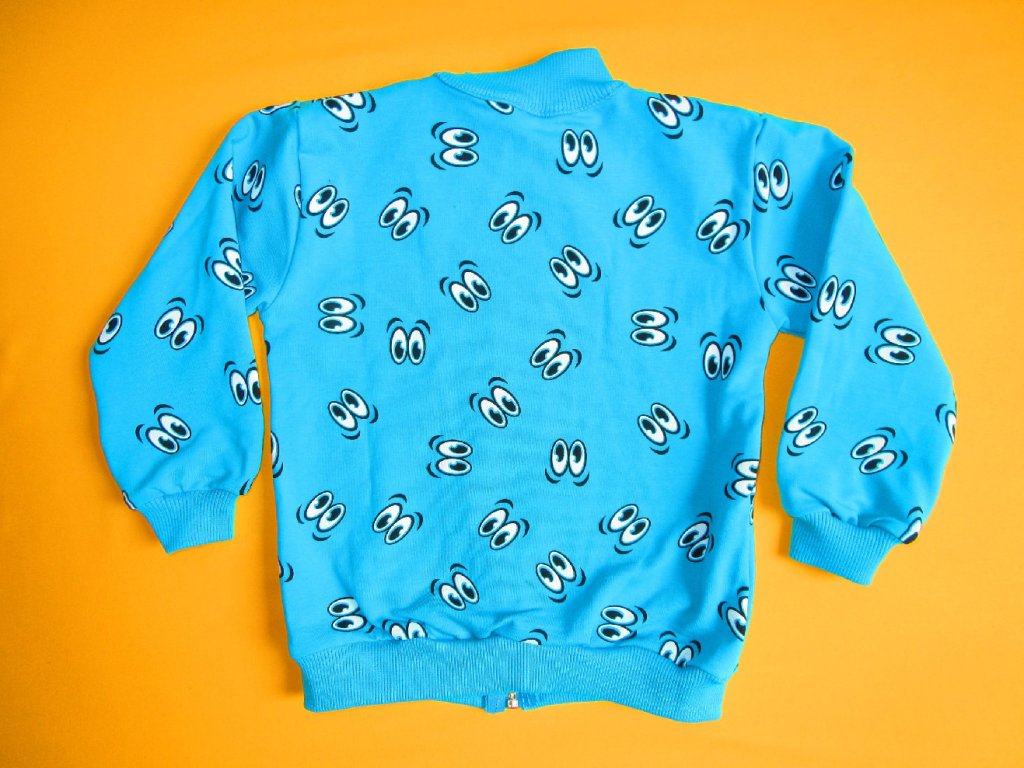 Tepláková souprava je ušita z příjemného nepočesaného mírně elastického bavlněného úpletu. Mikina je celopropínací na zip a je ozdobena potiskem s motivem očí. Proti skřípnutí kůže zipem má mikina u krku všitou praktickou krytku. Rukávy, výstřih i spodní část mikiny jsou zakončeny barevně sladěným pružným lemem. Mikina je jednoduchá bez kapes. Jednobarevné tepláky jsou v pase do širší všité gumy. Nohavice jsou zakončeny pružnou manžetou. Tepláky jsou jednoduché bez kapes. Doporučený způsob praní: v pračce na 40ᵒC. Prát a žehlit po rubové straně.