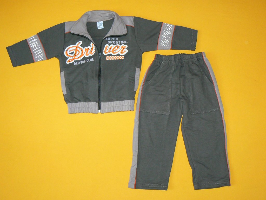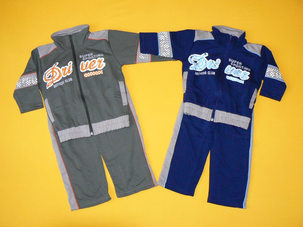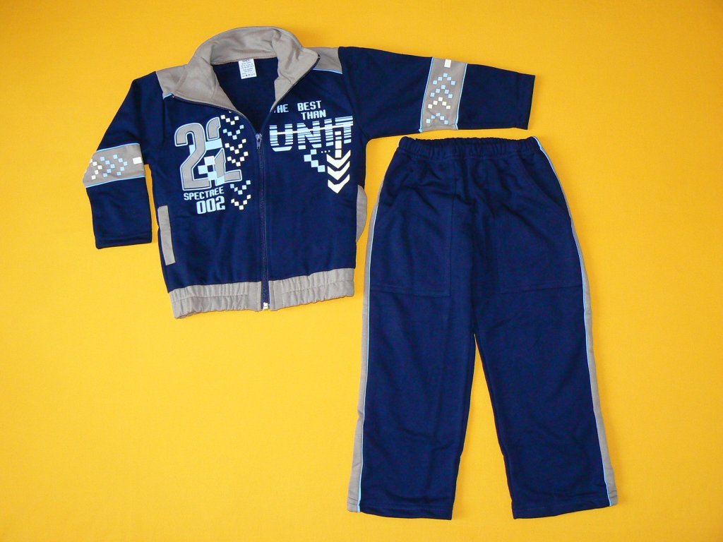 Bunda je na předním díle a na rukávech zdobená barevným potiskem. Její přední díl je celopropínací na zip, po stranách má všité kapsy. Okolo krku je stojáček. Kalhoty mají na předním dílu dvě našité kapsy, po stranách jsou zdobeny lampasem. Horní část tepláků a spodní část bundy jsou staženy do gumy. Ušito z teplákoviny bez počesu. U velikostí 104 a 110 je potisk odlišný.