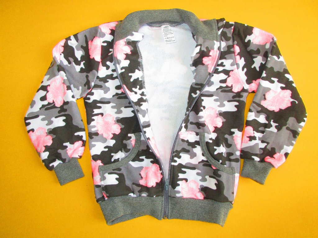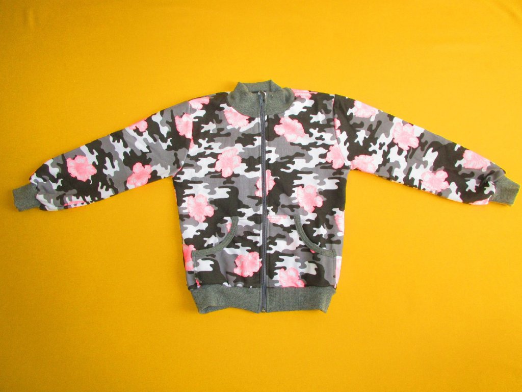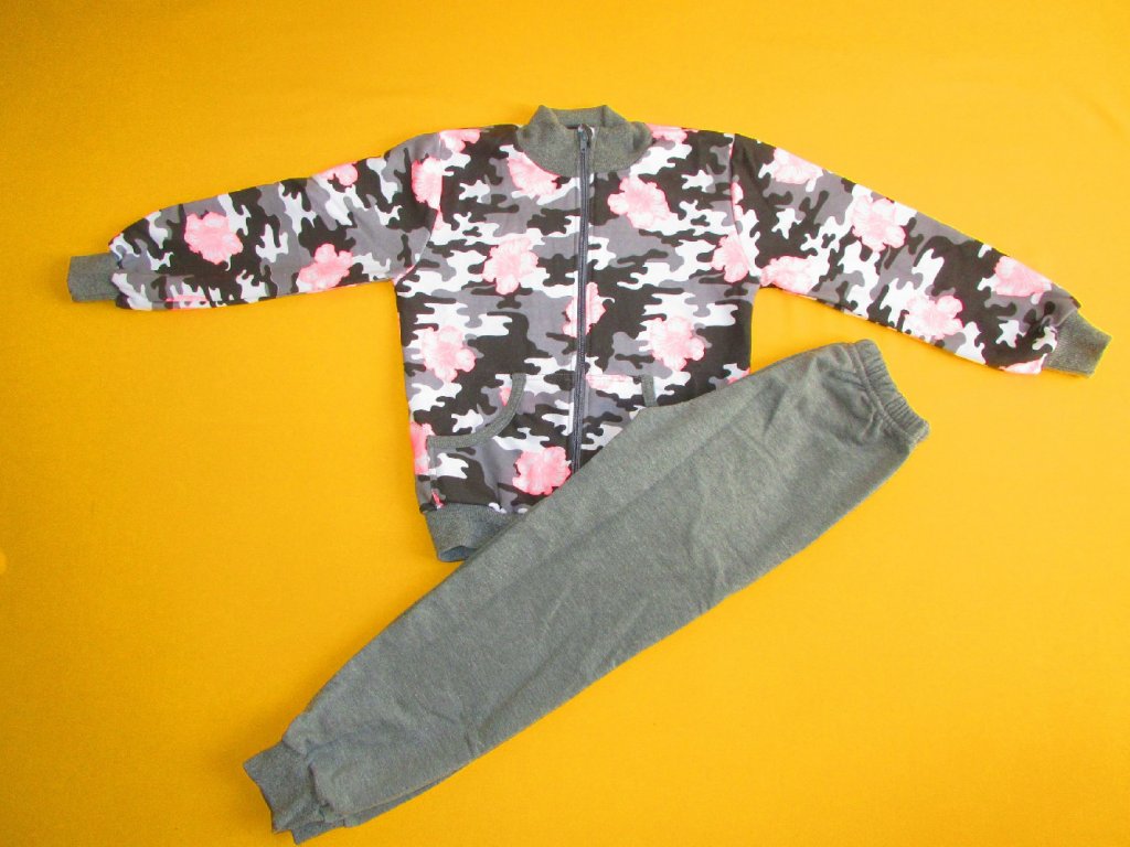 Moderní tepláková souprava se skládá z celopropínací mikiny a tepláků do pasu. Mikina je ušita z příjemného jednolícího mírně elastického bavlněného materiálu. Maskáčový vzor v černo-bílém provedení je zjemněn výraznou růžovou květinou. Mikina je celopropínací na barevně sladěný zip. U krku je je všitá krytka, která brání skřípnutí kůže zipem. Stojáček u krku, rukávy a spodní lem mikiny jsou z jednobarevného pružného lemu. Na obou předních dílech mikiny jsou našité kapsy typu rozpůlené klokanky, olemované jednobarevným lemem. Jednobarevné tepláky jsou ušity z příjemného jednolícího 100% bavlněného materiálu. V pase je všitá nevyměnitelná guma. Nohavice jsou zakončeny praktickými manžetami s pružného lemu. Po stranách tepláků jsou všité kapsy. Doporučený způsob praní v pračce na 40ᵒC. Prát a žehlit po rubové straně.