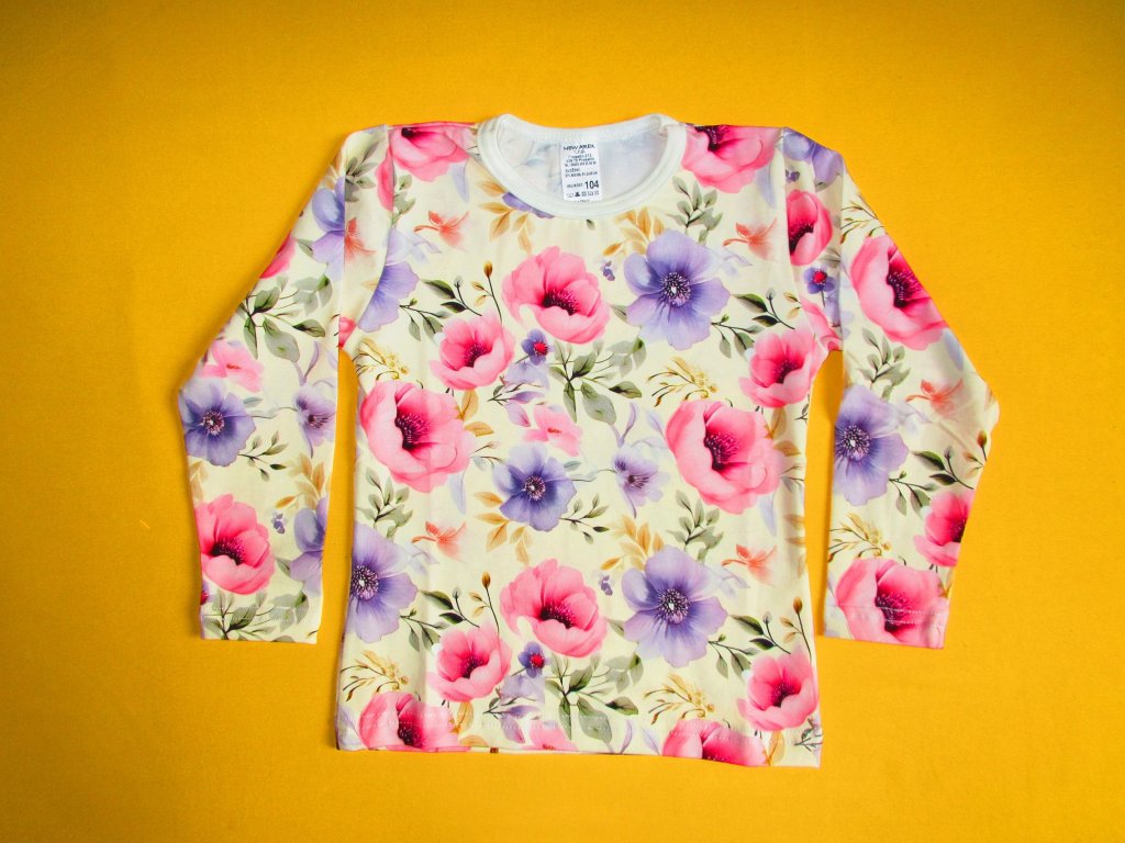 Dívčí tričko s dlouhým rukávem je ušito z příjemného mírně elastického bavlněného materiálu. Krásný motiv květin je na látku natištěn pomocí moderní metody fototisku. Potisk bez problémů vydrží opakované praní. Kulatý výstřih je ukončeny barevně sladěným lemem s dvojitým prošitím. Rukávy a spodní lem trička jsou ukončeny volně dvojitým prošitím. Tričko má mírně projmutý střih. Doporučený způsob praní: v pračce na 40ᵒC. Prát a žehlit po rubové straně.