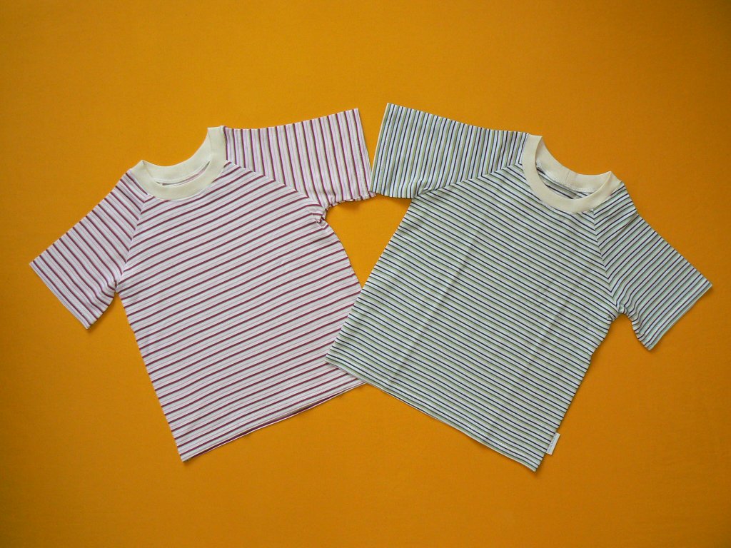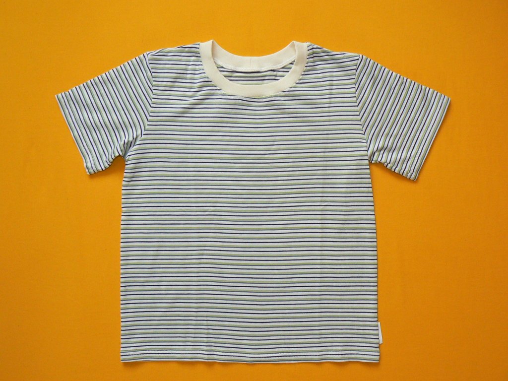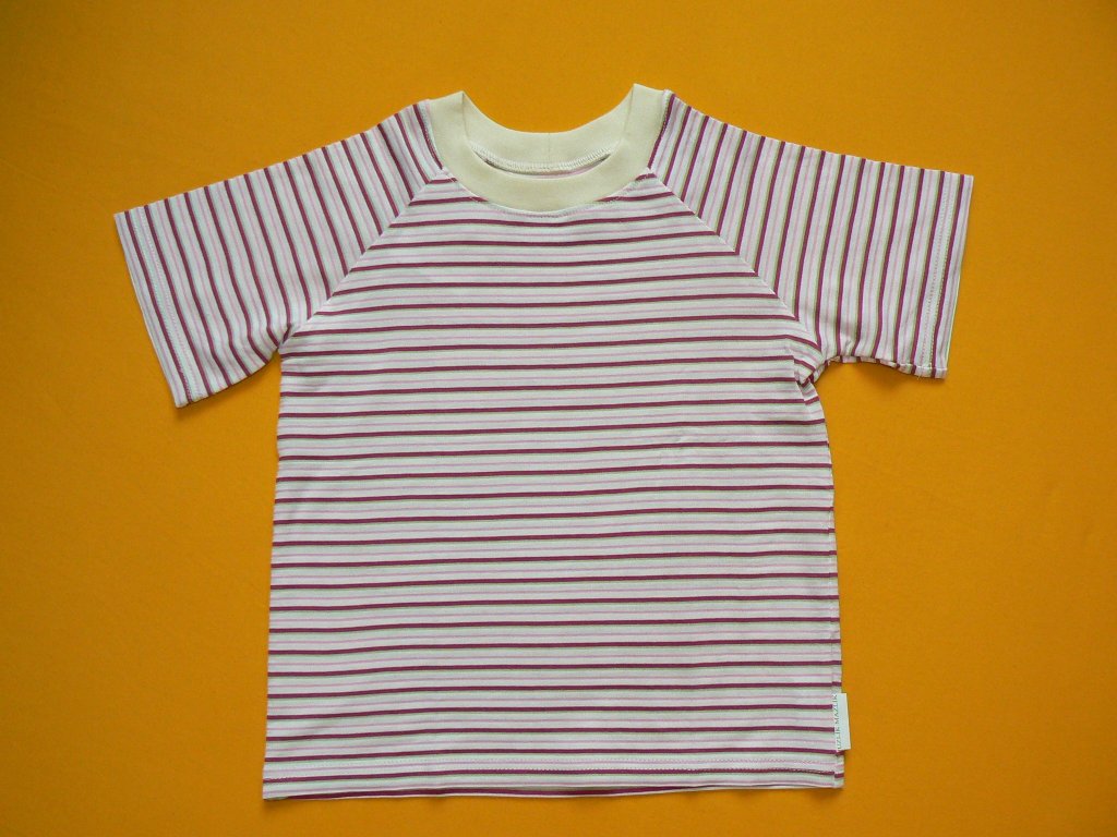 Tričko z velmi příjemného materiálu - bambus kombinovaný s bavlnou je ideální pro teplé letní dny. Horizontální proužky jsou u krku oživeny pružným lemem v barvě natur. U triček do velikosti 110 (včetně) jsou rukávy raglánového typu. Zboží 2. jakosti - po vyprání může dojít ke spuštění oček ve švu.