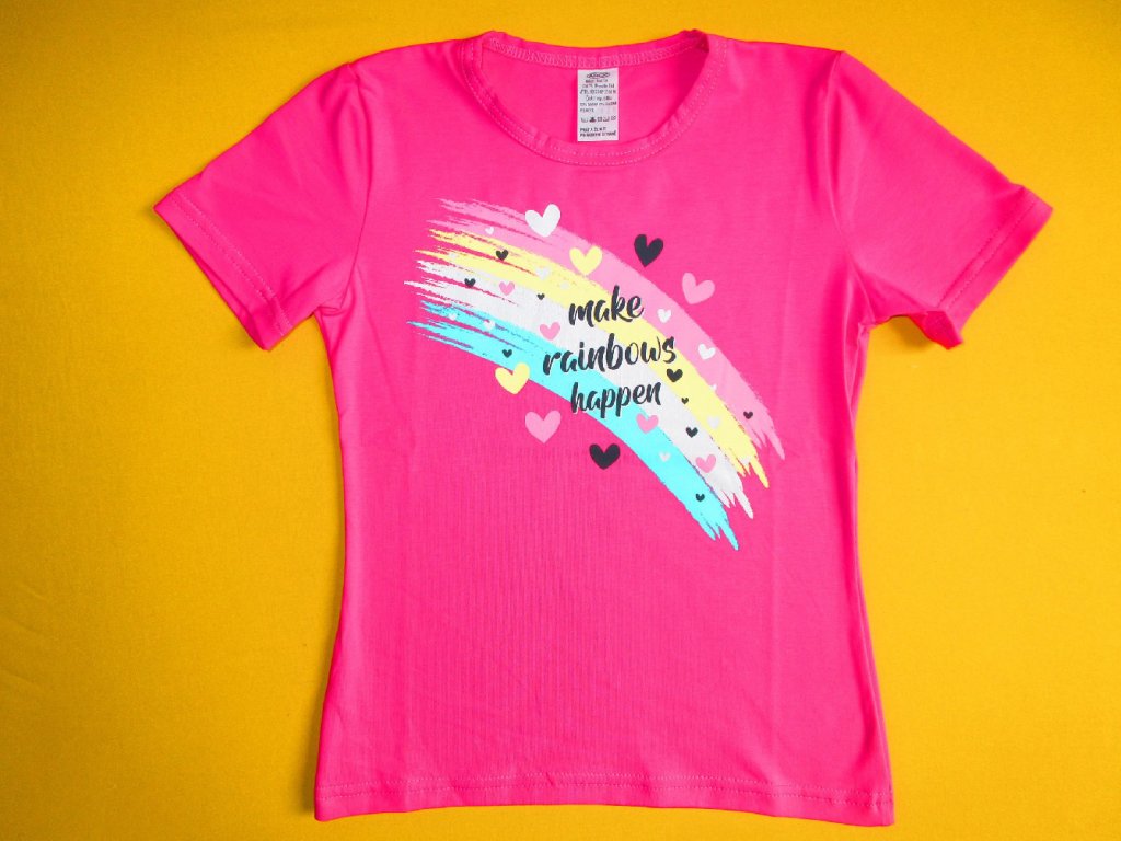 Dívčí tričko s krátkým rukávem je ušito z kvalitního a příjemného mírně elastického bavlněného materiálu. Díky mírně projmutému střihu tričko krásně sedí. Přední díl je ozdoben kvalitním potiskem s motivem duhy, který je prodyšný a bez problémů vydrží opakované praní. Výstřih, spodní lem a lem rukávů jsou ozdobeny dvojitým prošitím. Doporučený způsob praní v pračce na 40ᵒC, prát a žehlit po rubové straně.